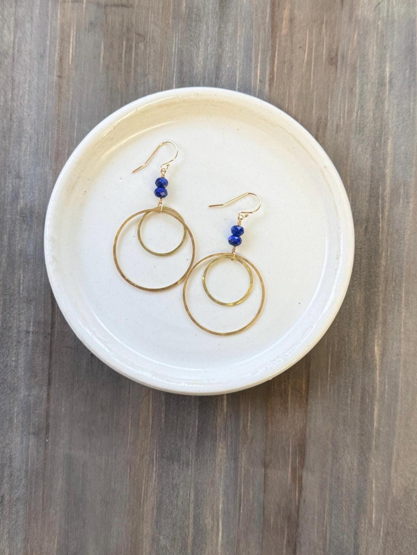 Lightly hammered 14k gold fill Double Hoop earrings with beautiful natural dark blue Lapis stones. Perfect for a December birthday gift. Elegant, simple dark blue stones and brass hammered hoops. These dangle from 14k gold fill hooks. Easy to wear and gift.