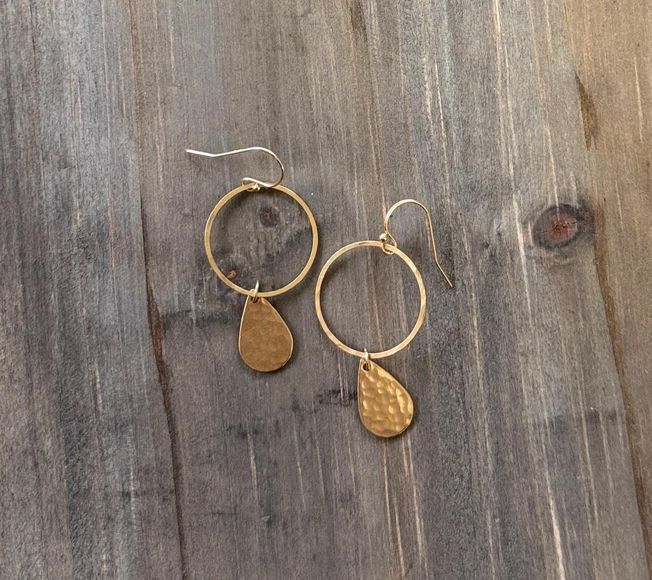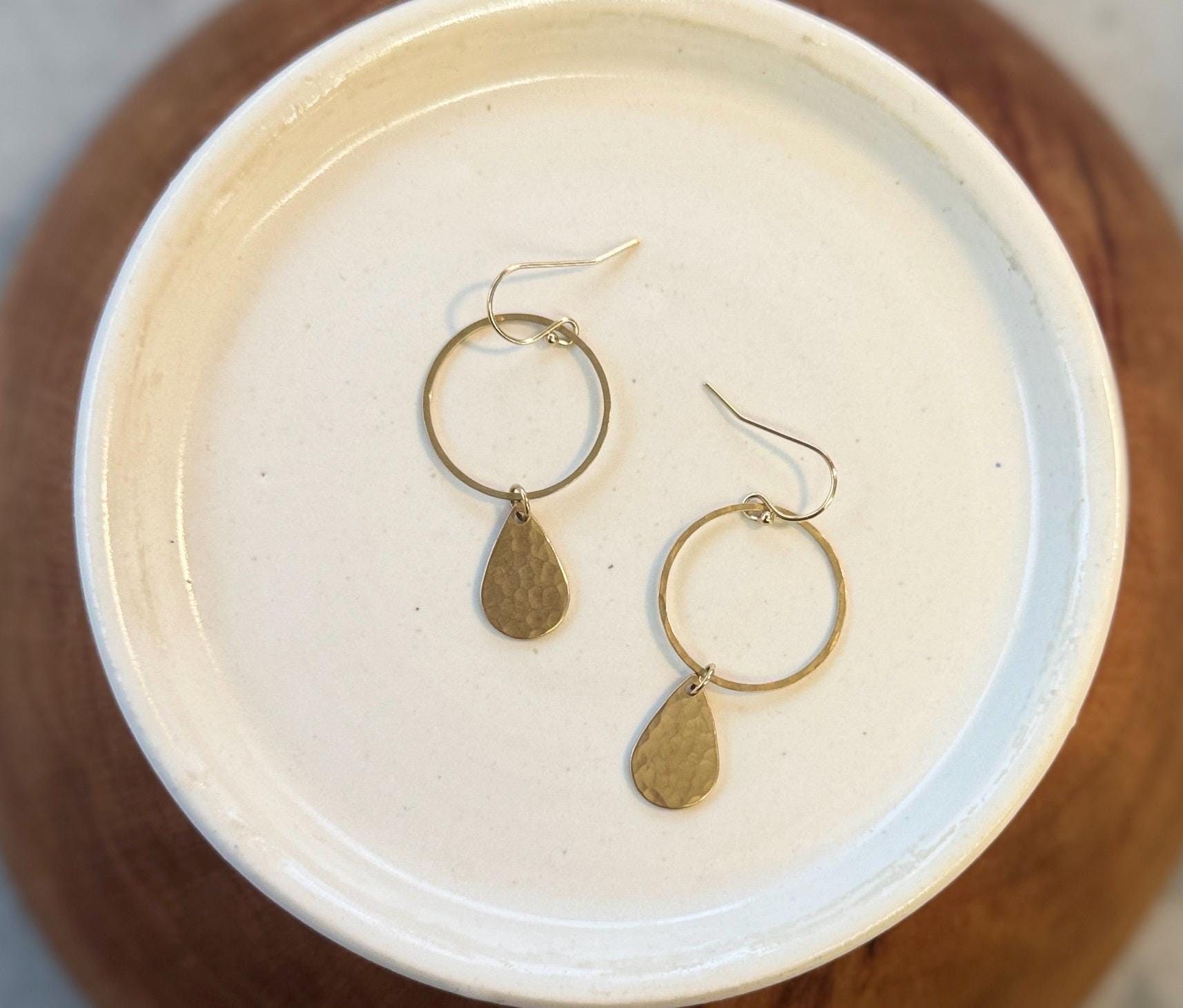 Brass Hoop & Teardrop Earrings, Simple Gold Earrings, Hammered Jewelry