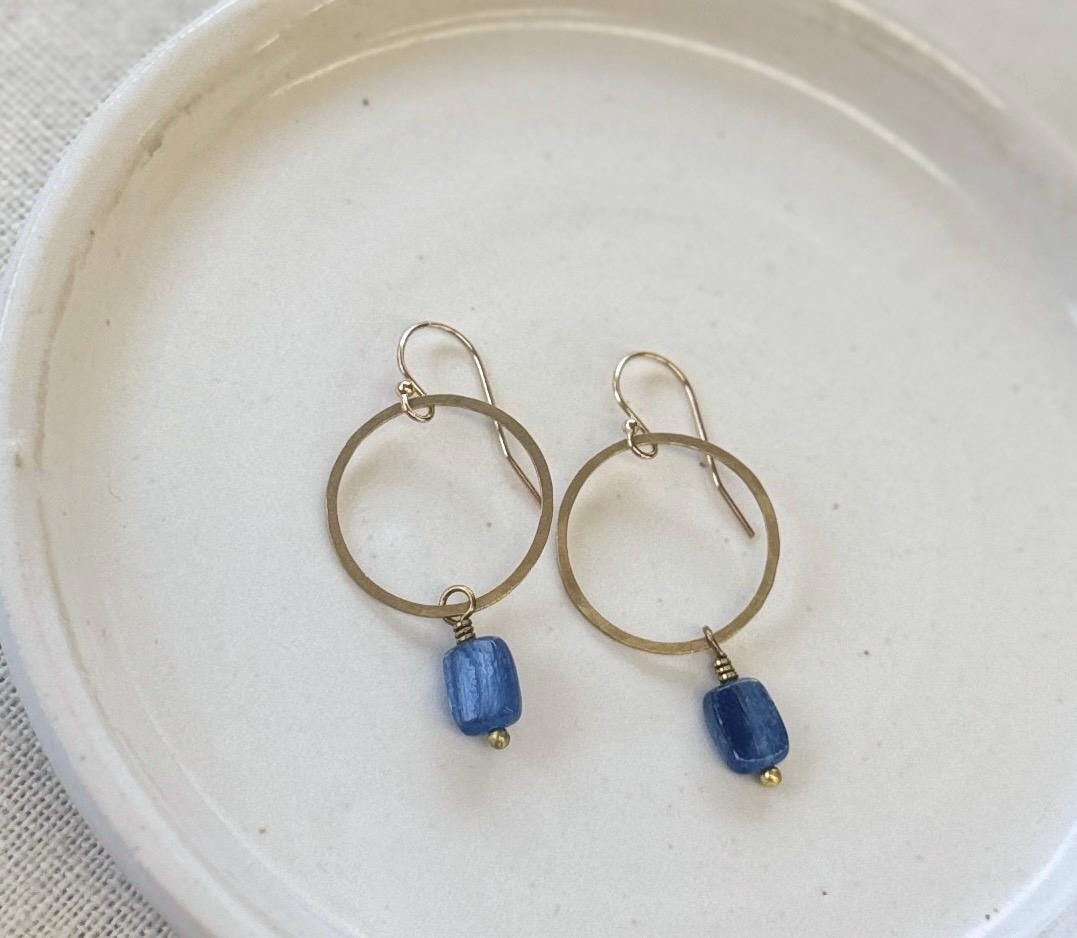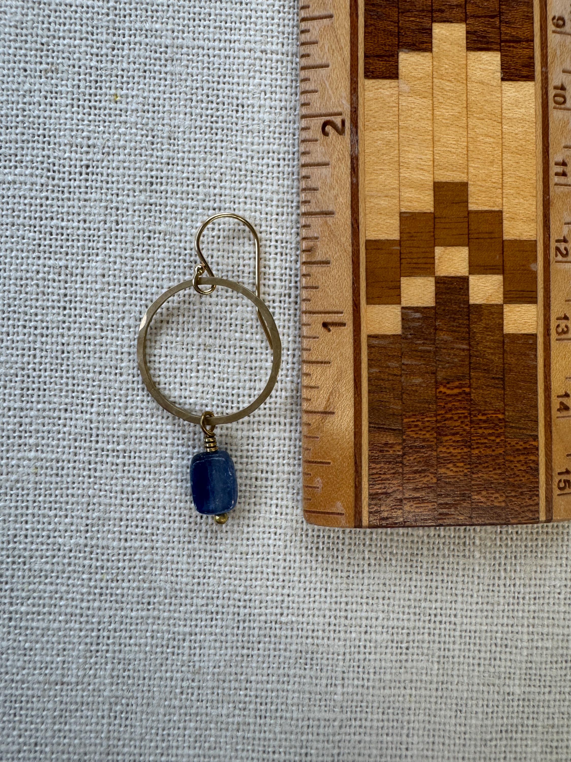 Blue Circle Earrings, Kyanite and Brass Dainty Hammered hoops, natural blue gemstones, 14k gold fill hooks.
