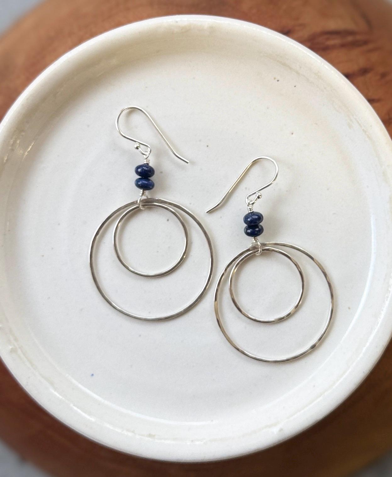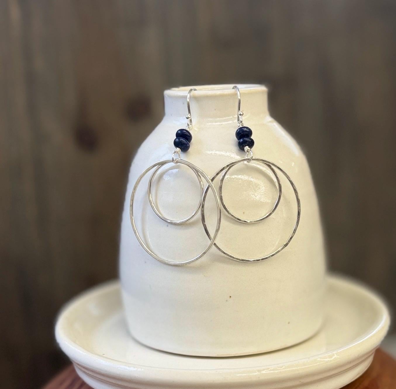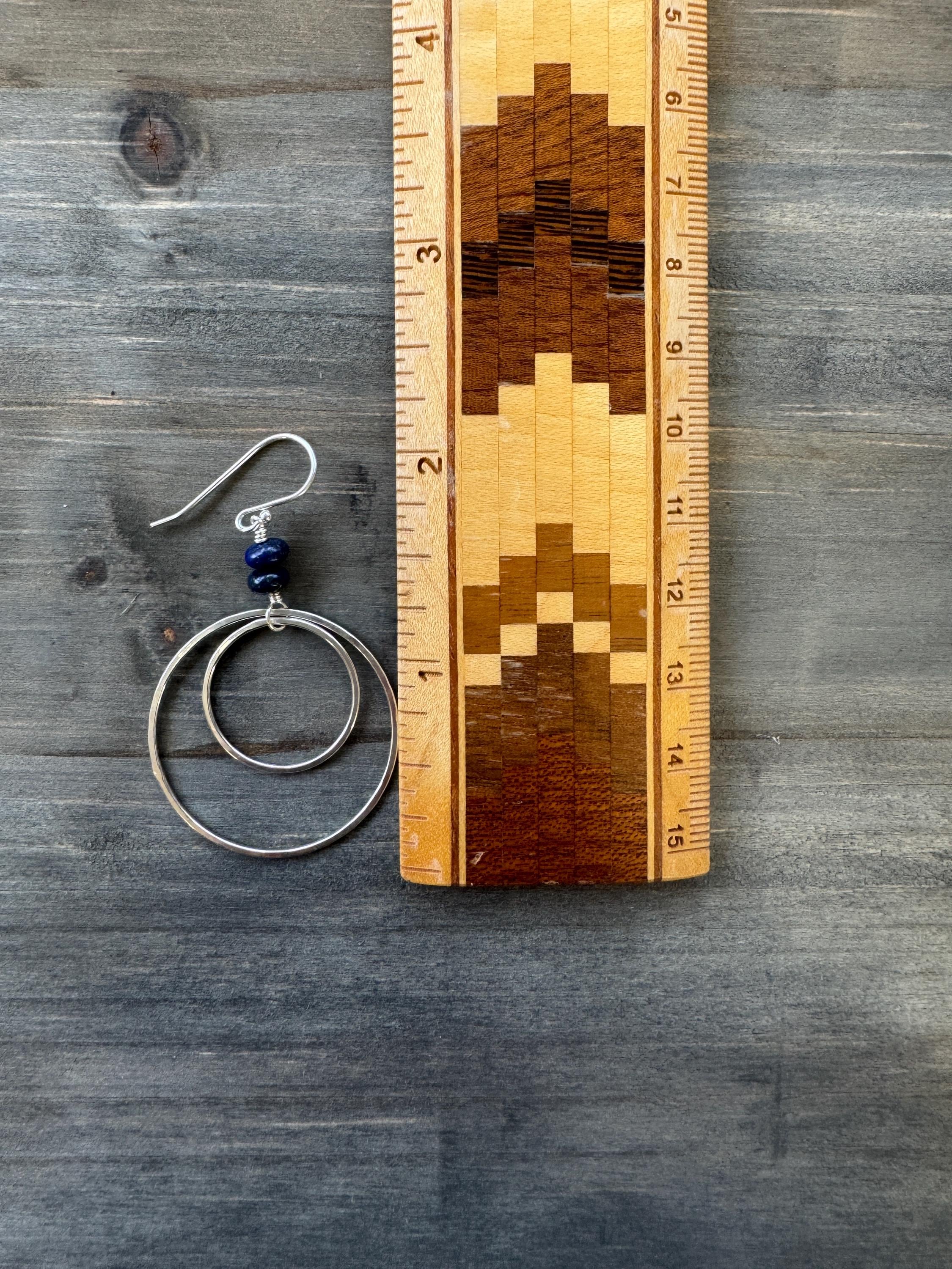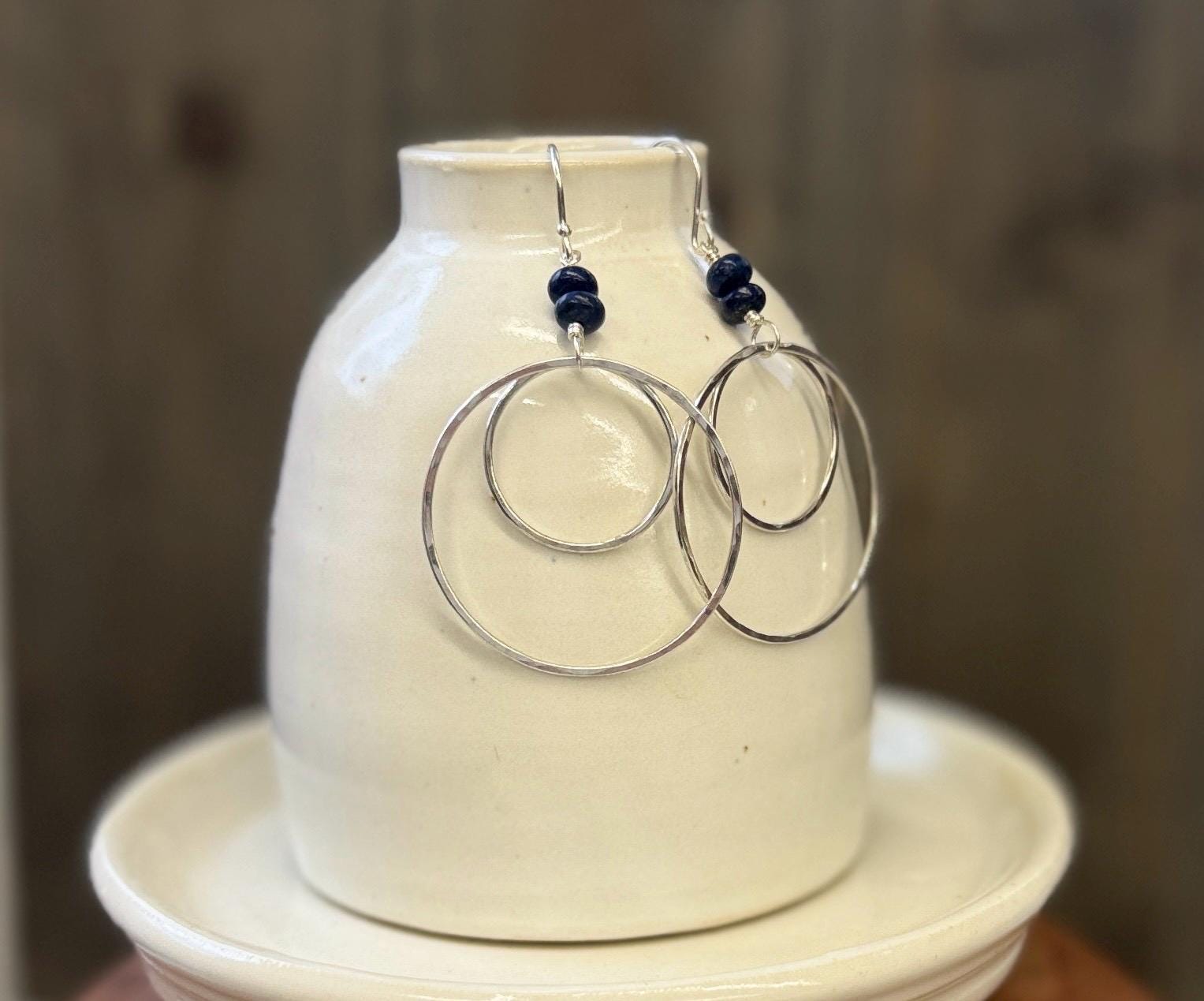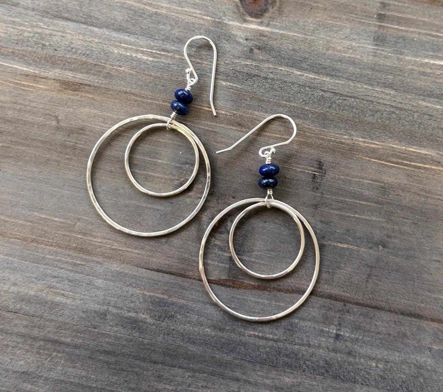 Lapis Gemstone & Sterling Silver, Pretty Hammered Silver Double Hoops, Natural Blue Earrings, December Birthstone Jewelry