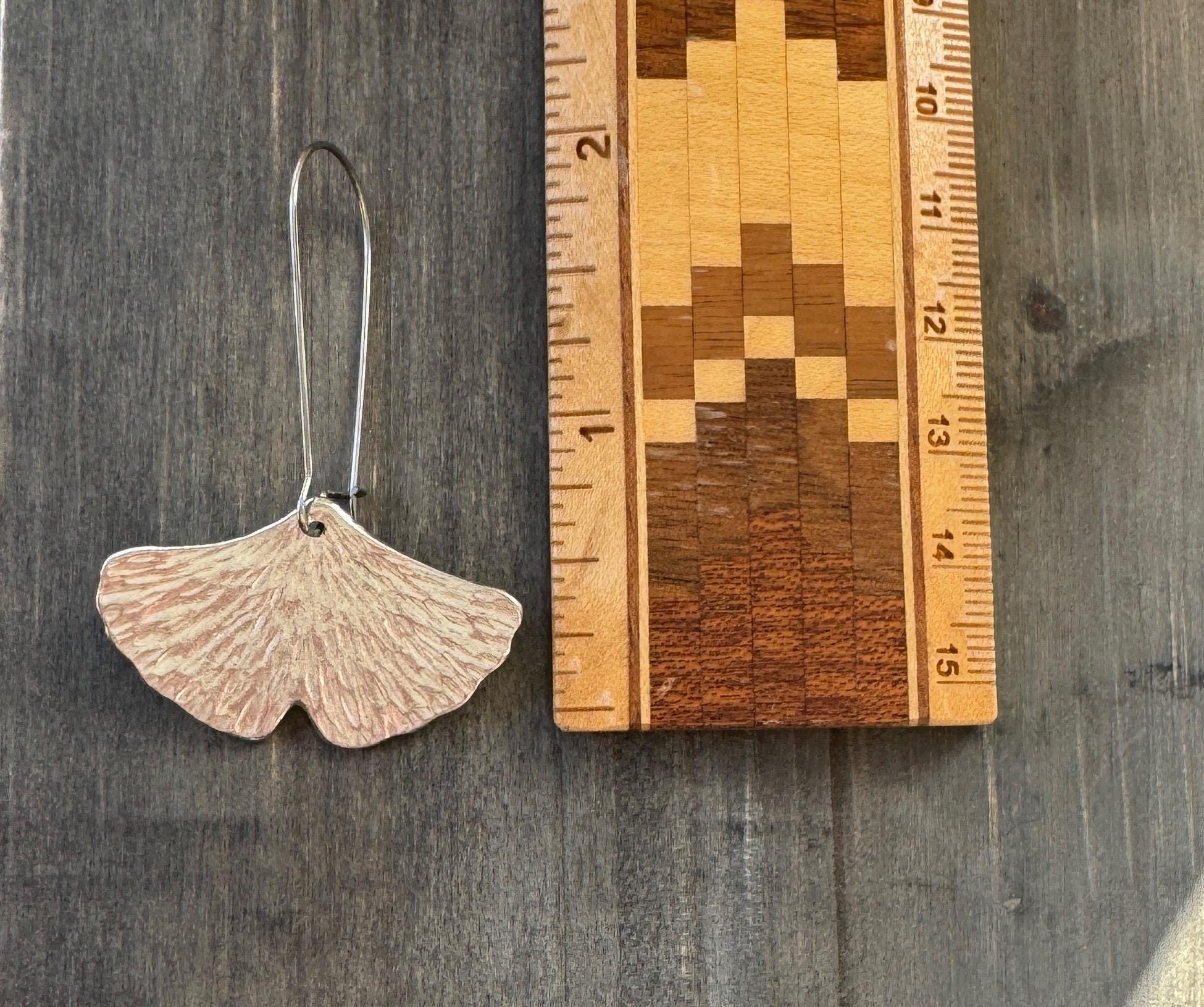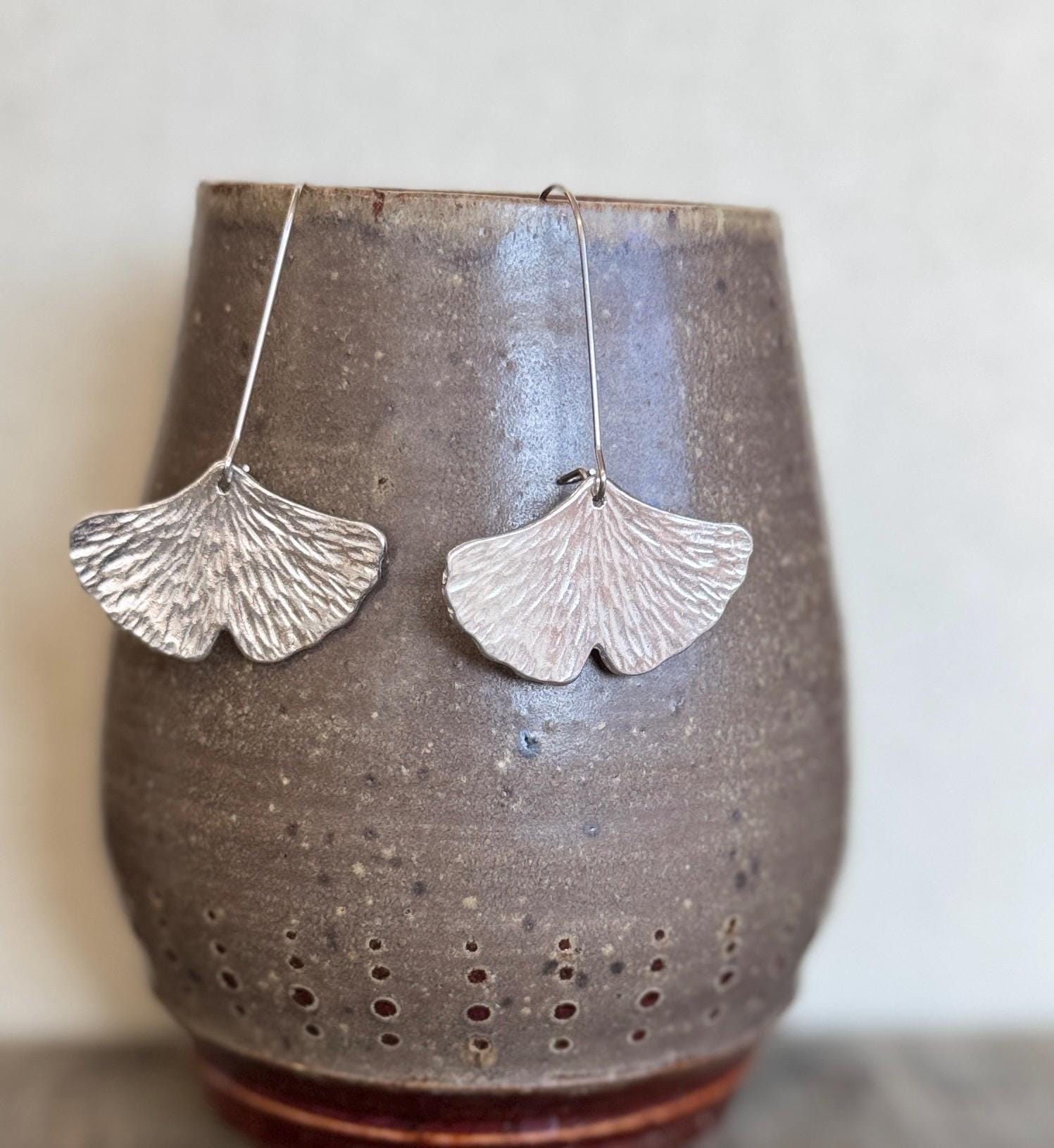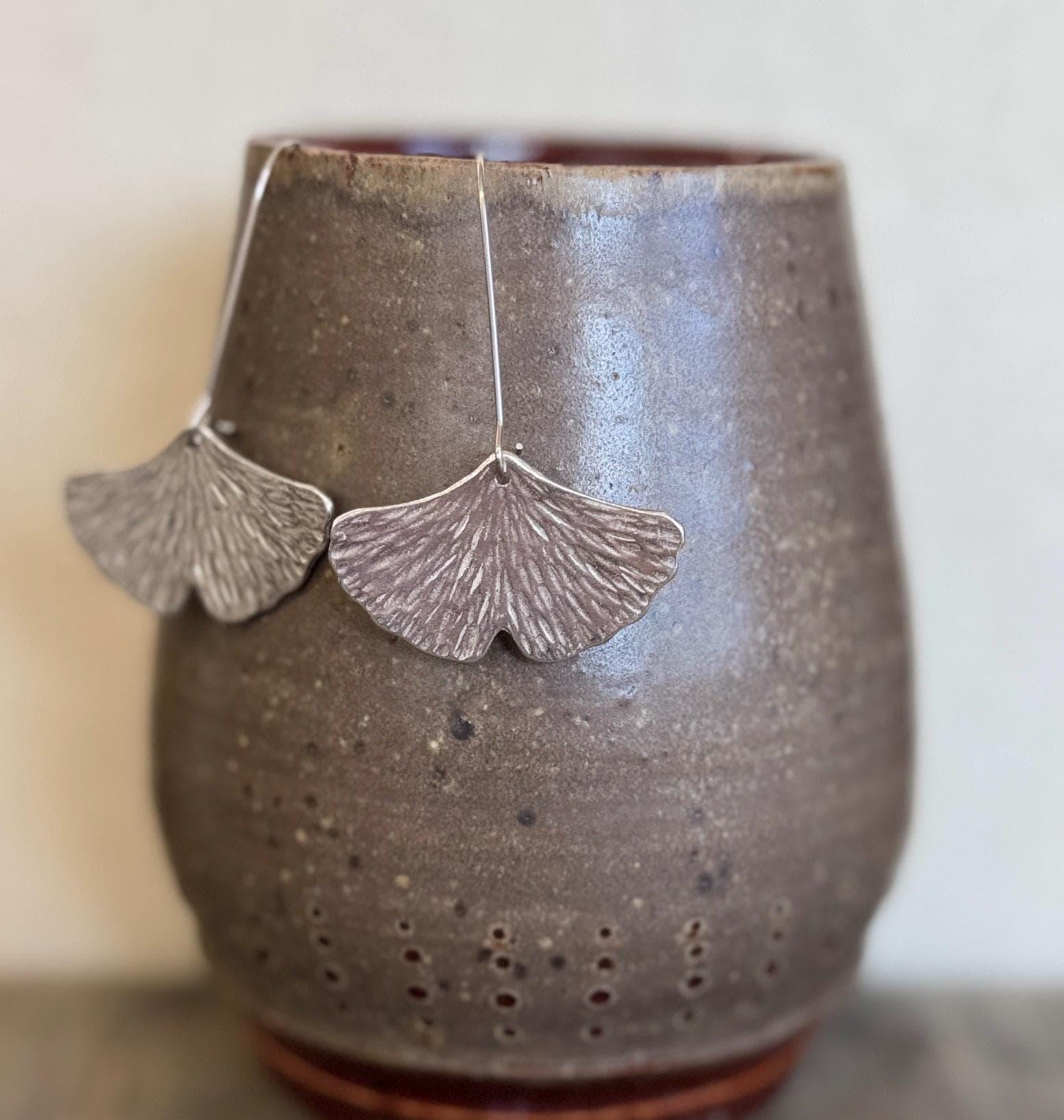 These ginkgo leaf shaped earrings are pretty and modern, with a unique textured finish that will vary slightly from pair to pair.