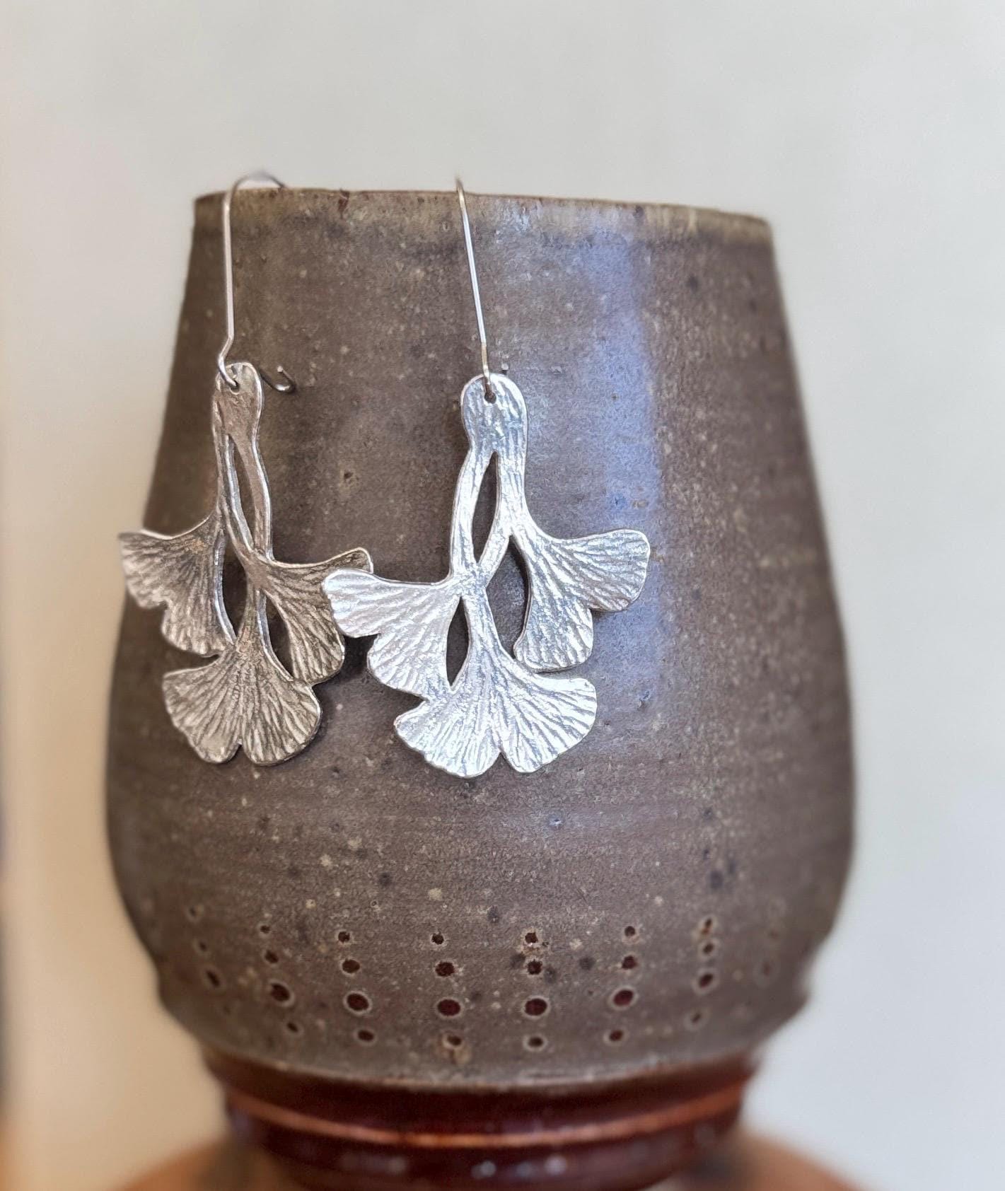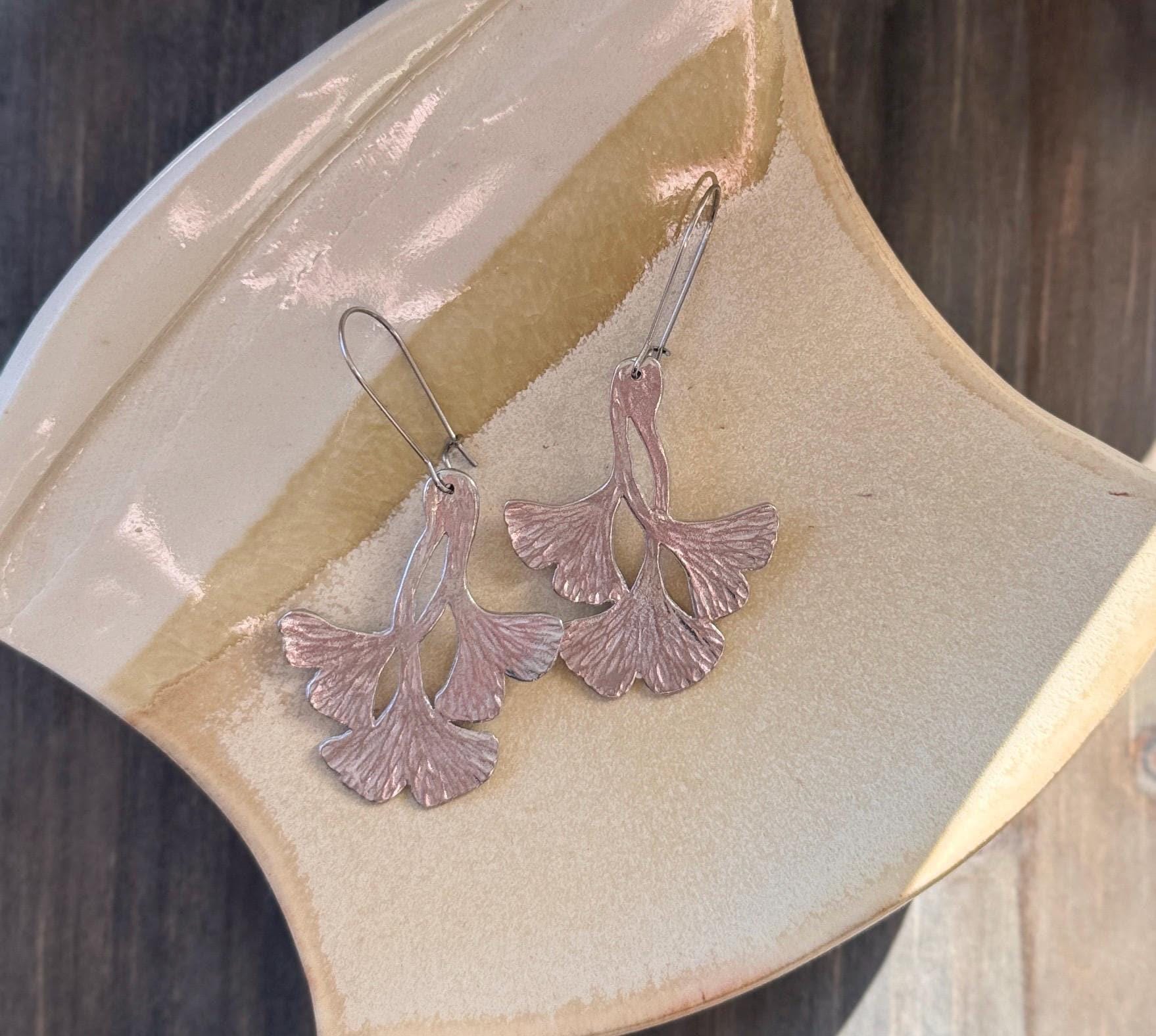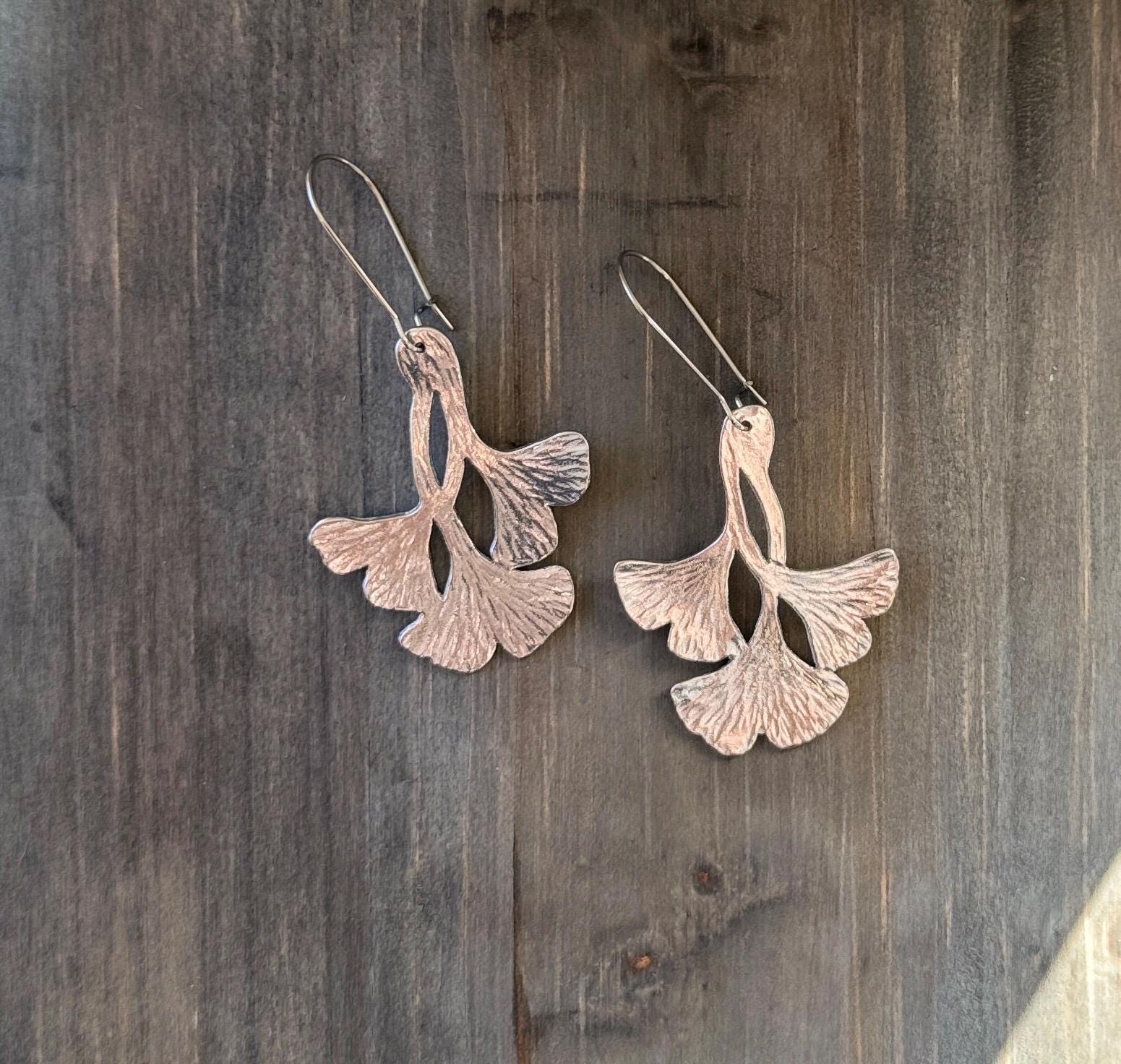 These ginkgo leaf shaped earrings are pretty and modern, with a unique textured finish that will vary slightly from pair to pair.
