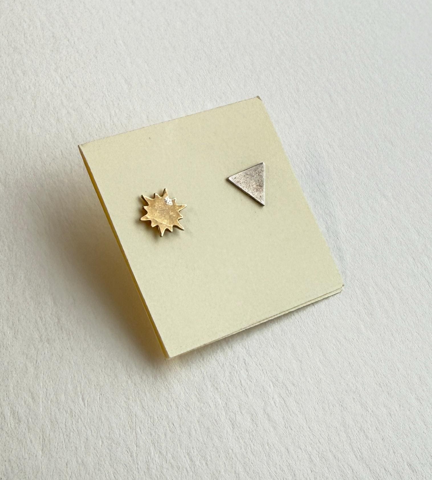 Pretty mismatched sunburst and triangle shaped earrings. The sunburst is brass, the triangle is sterling silver, and both feature sterling silver posts and backs.