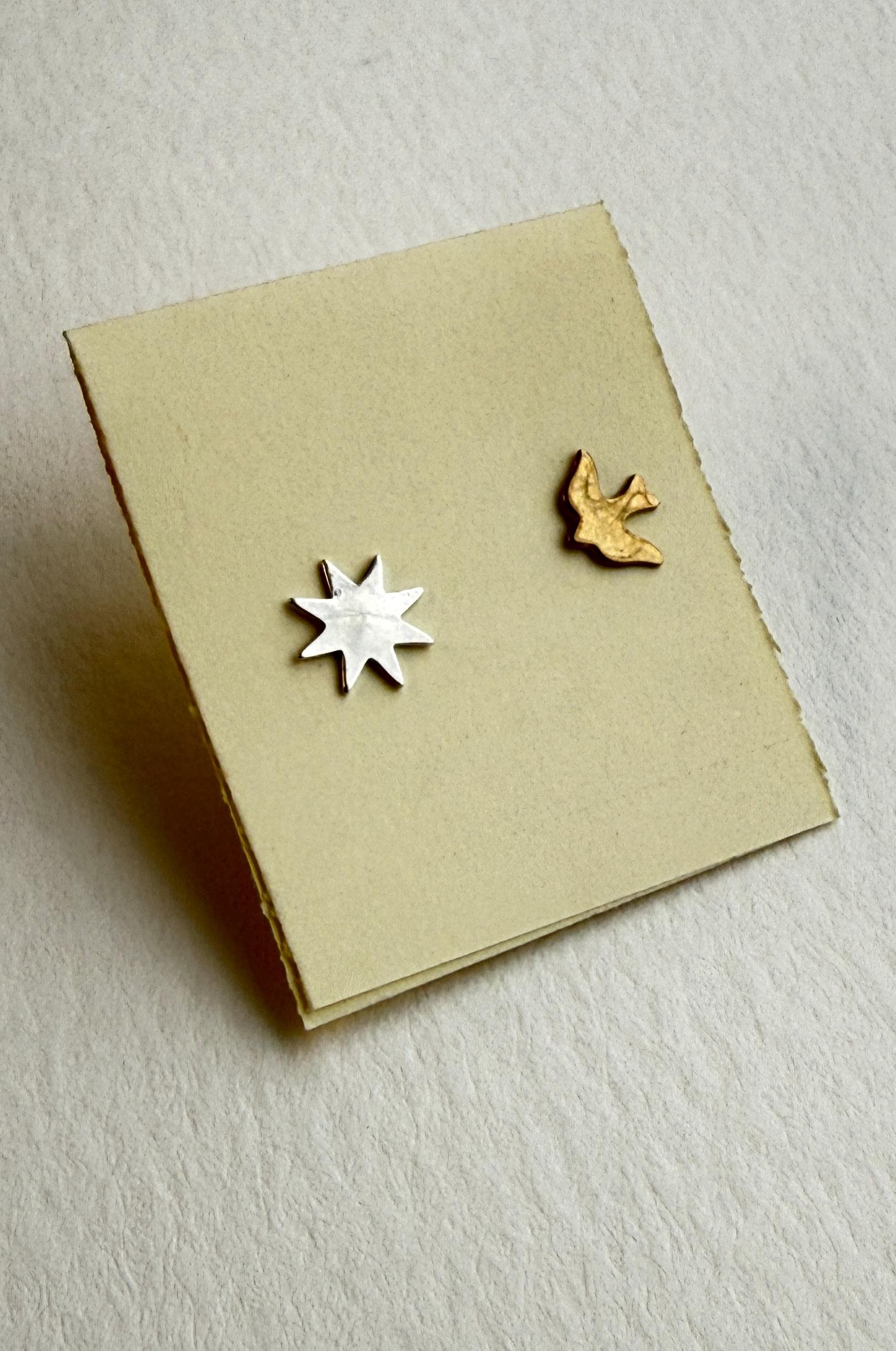 Pretty mismatched star and bird shaped earrings. The star is sterling silver, the bird is brass, and both feature sterling silver posts and backs.