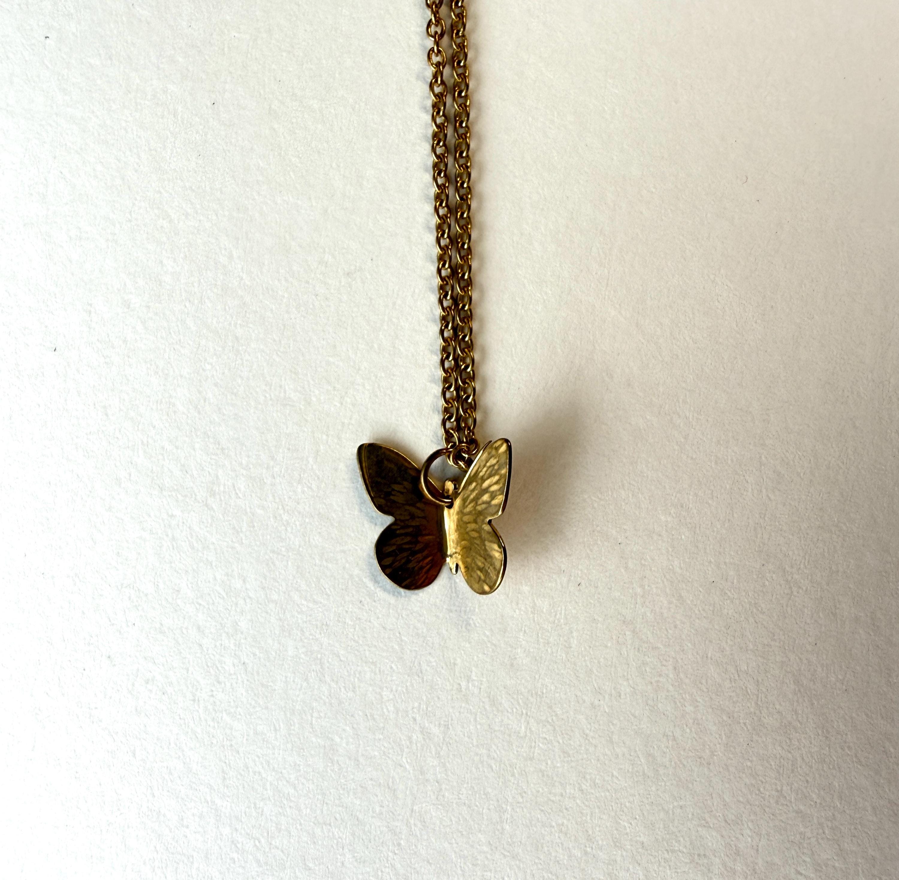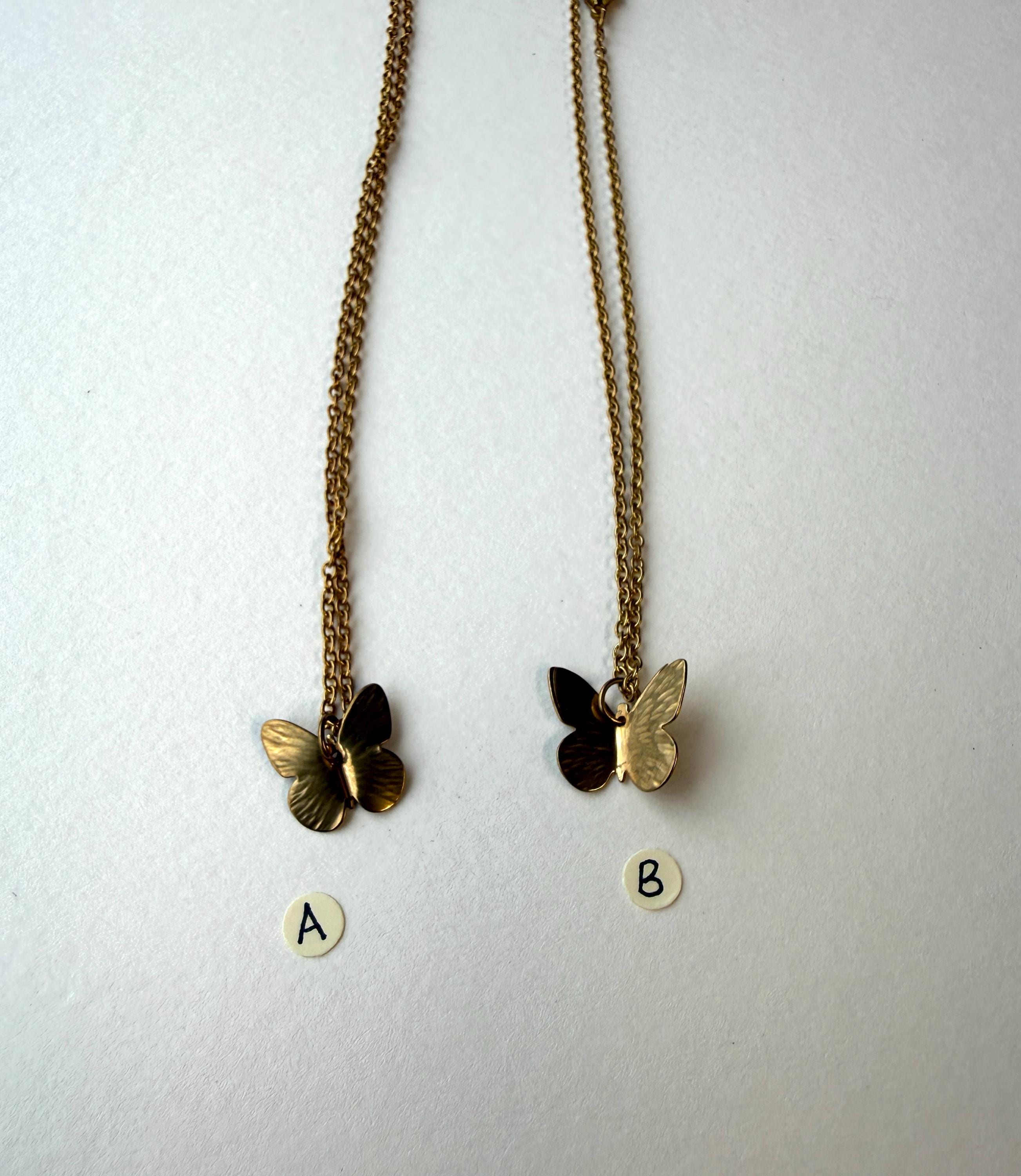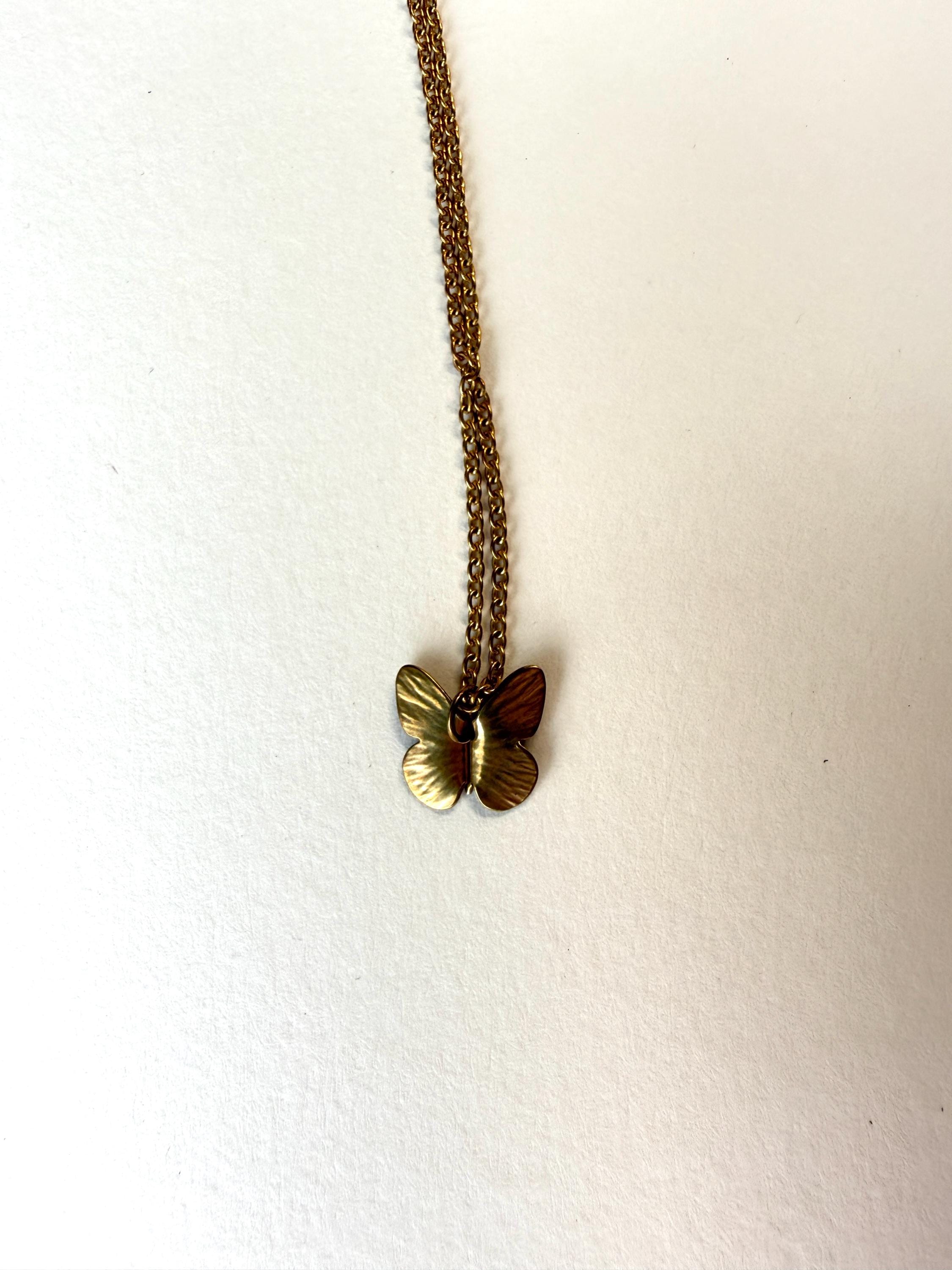 Sweet small brass butterfly necklace. Both butterflies are folded in middle to mimic the look of flight.