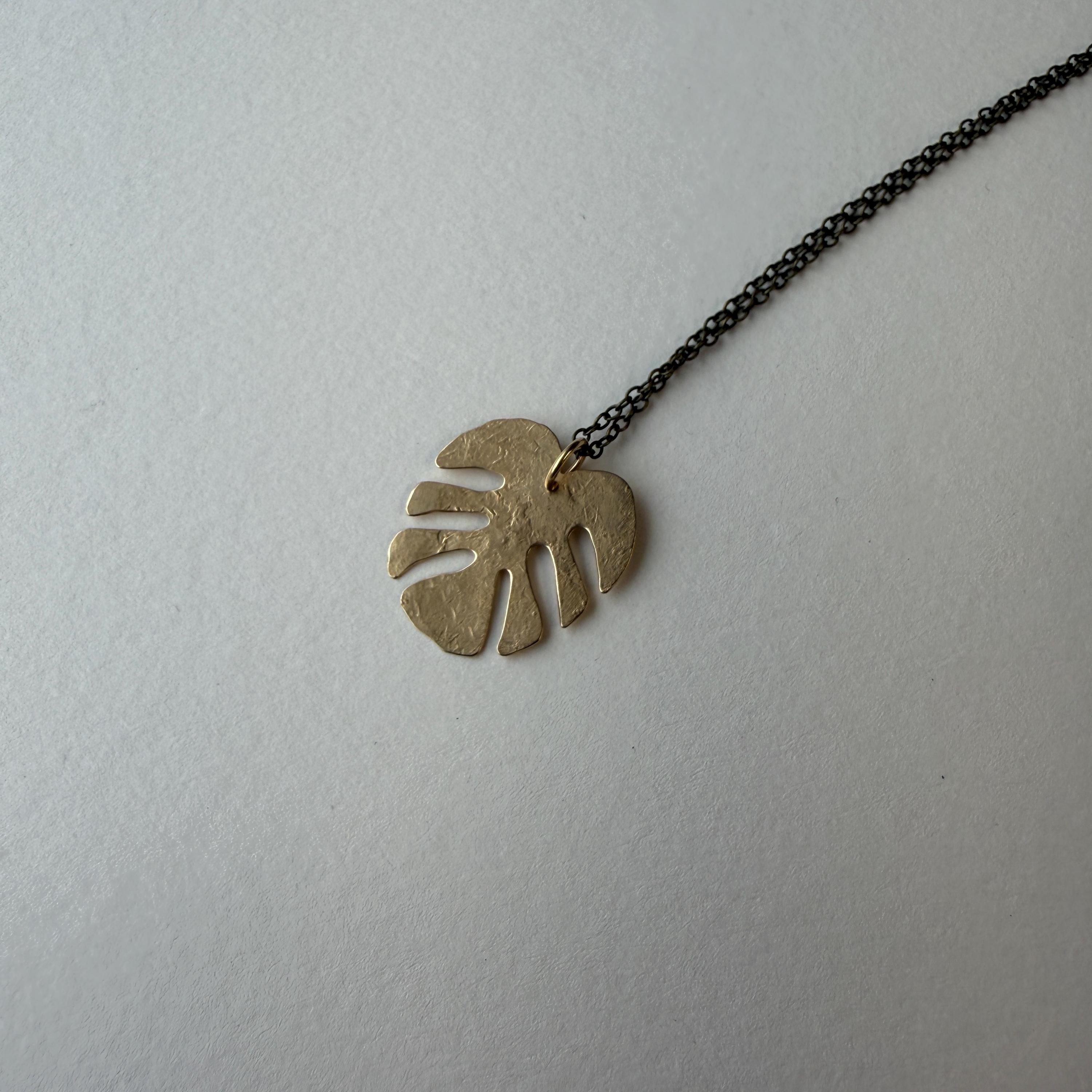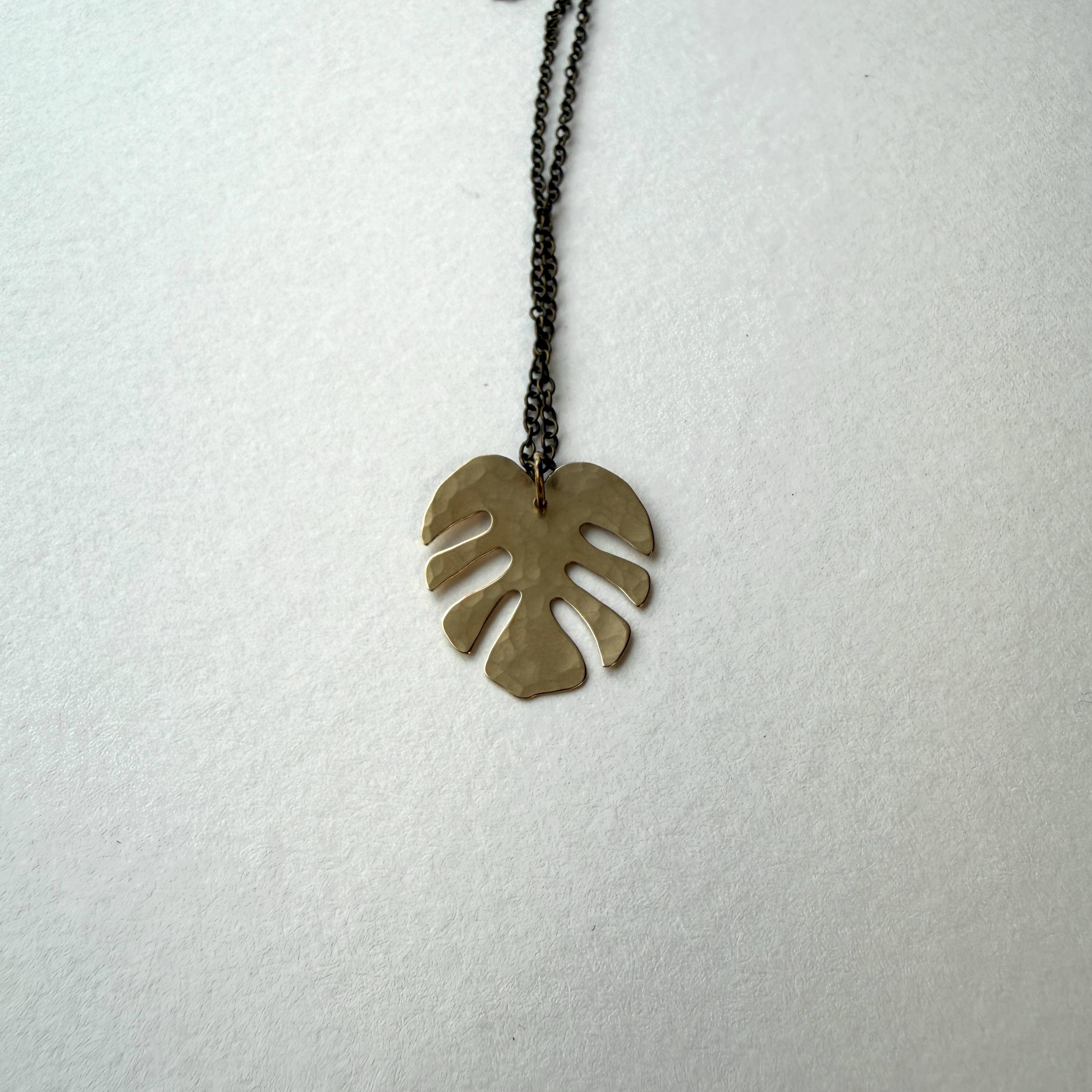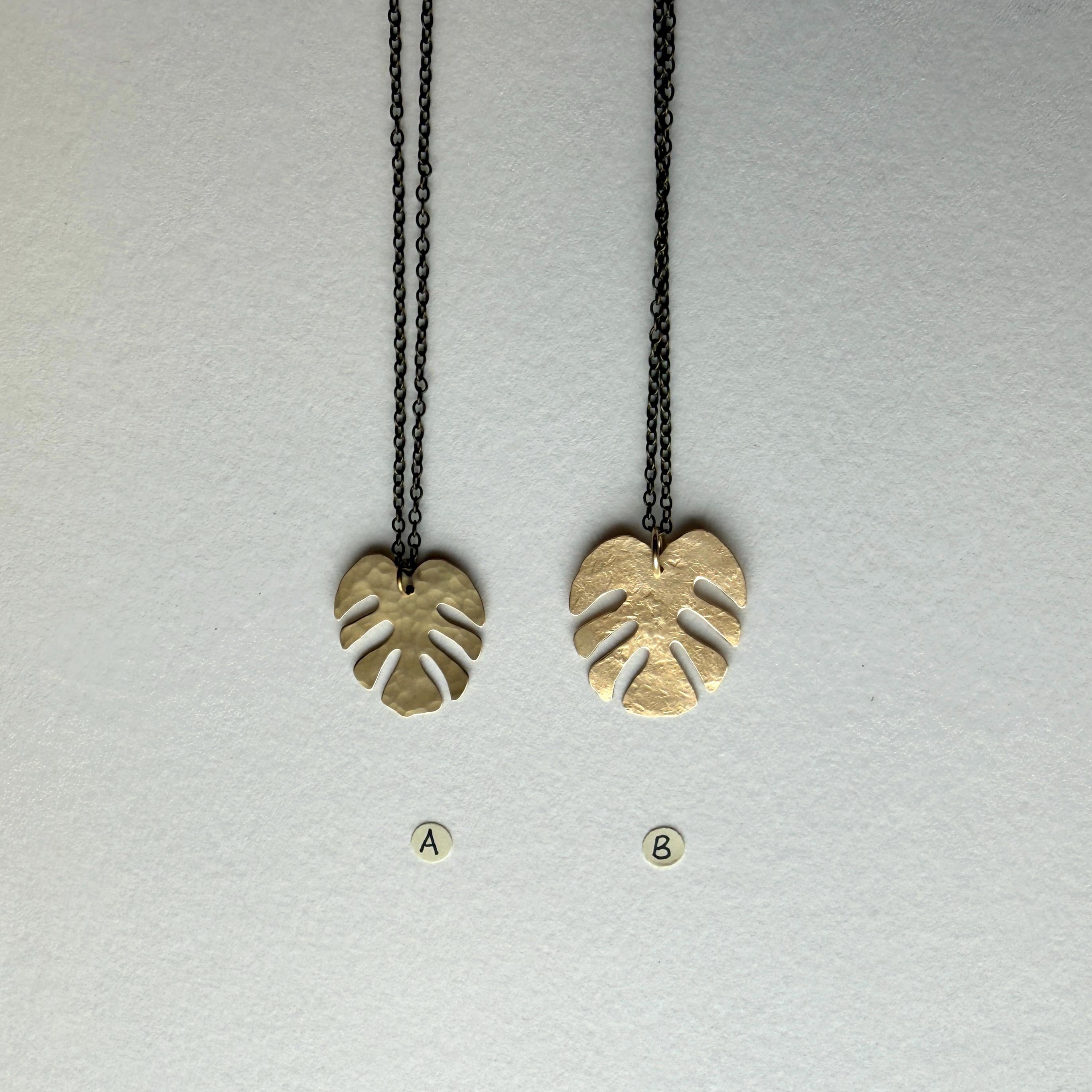 Beautiful monstera leaf brass necklaces. Styles A and B feature different hammer textures. The leaves dangle from brass chains.