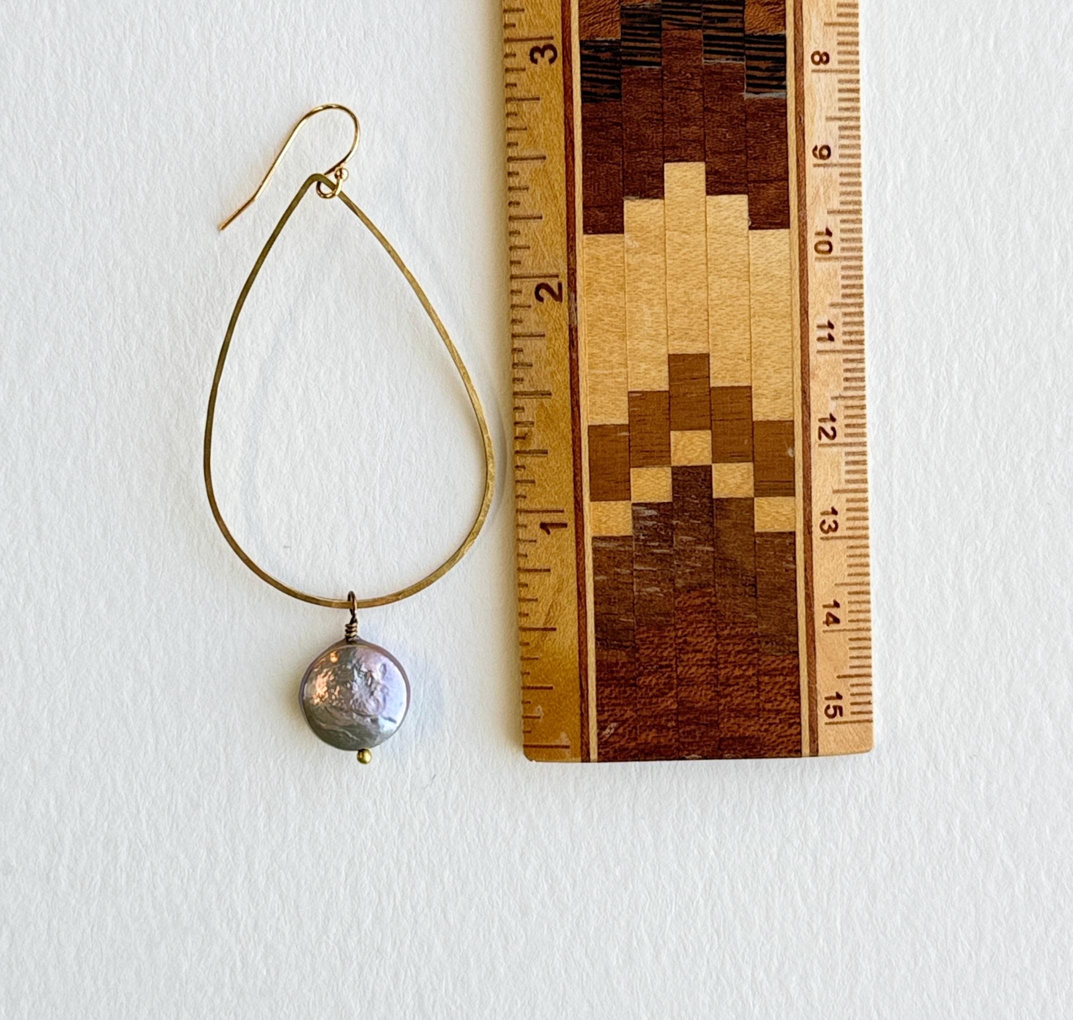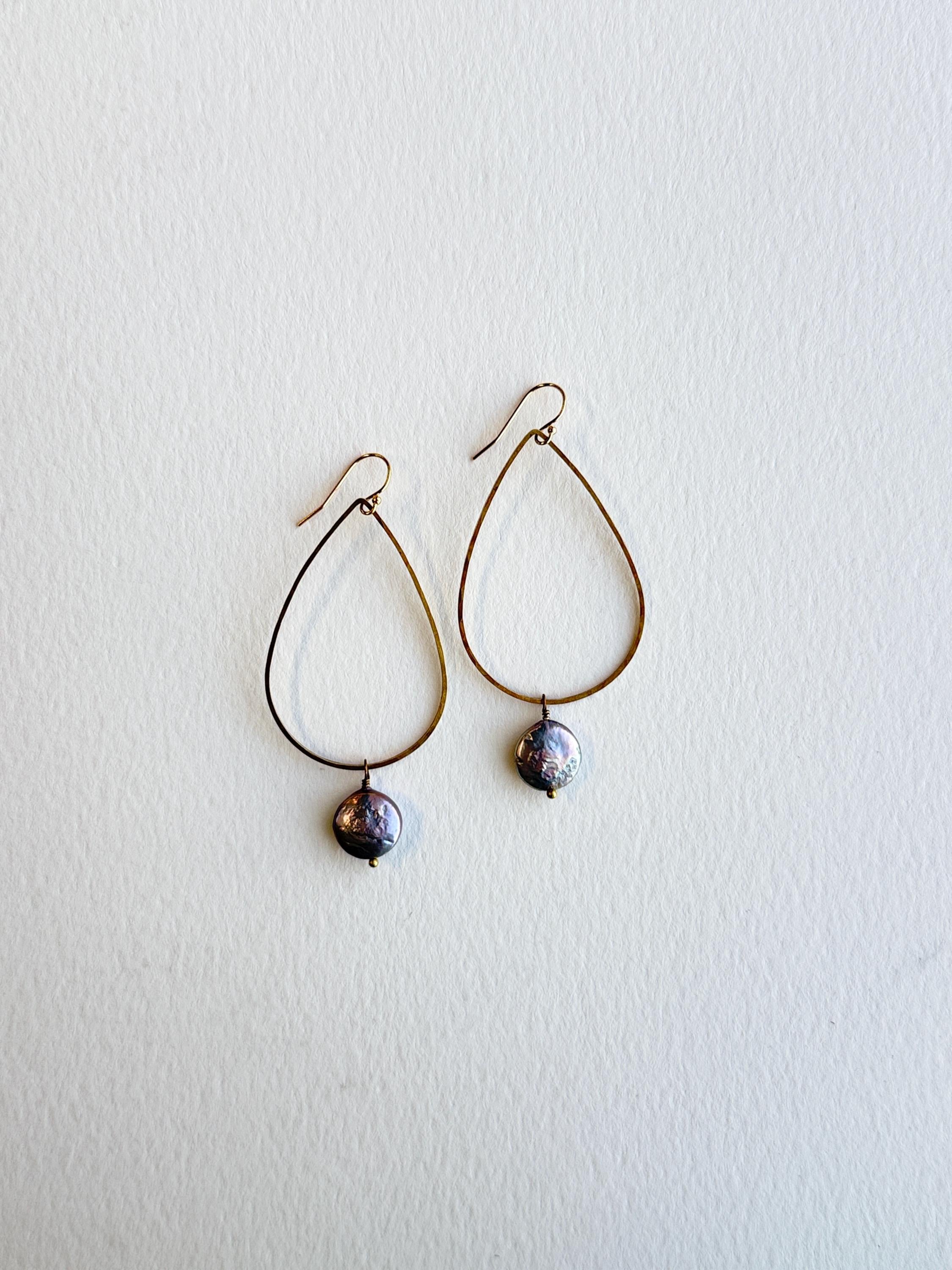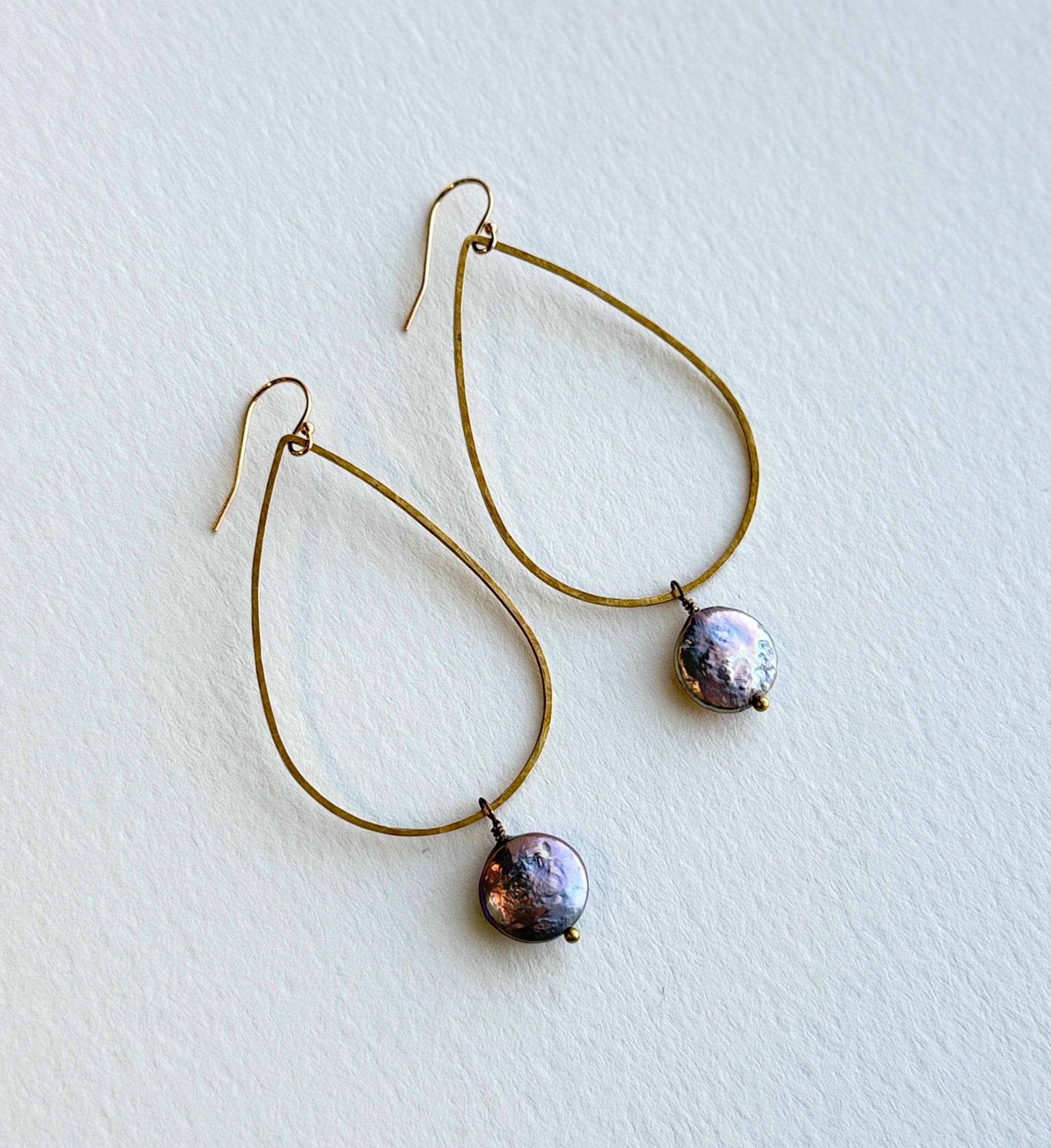 Lightly hammered teardrop shaped earrings with beautiful natural pearls. These pearls have a lovely blue-purple shine. Elegant, simple stones and brass hammered teardrops. These dangle from 14k gold filled hooks. Easy to wear and gift.