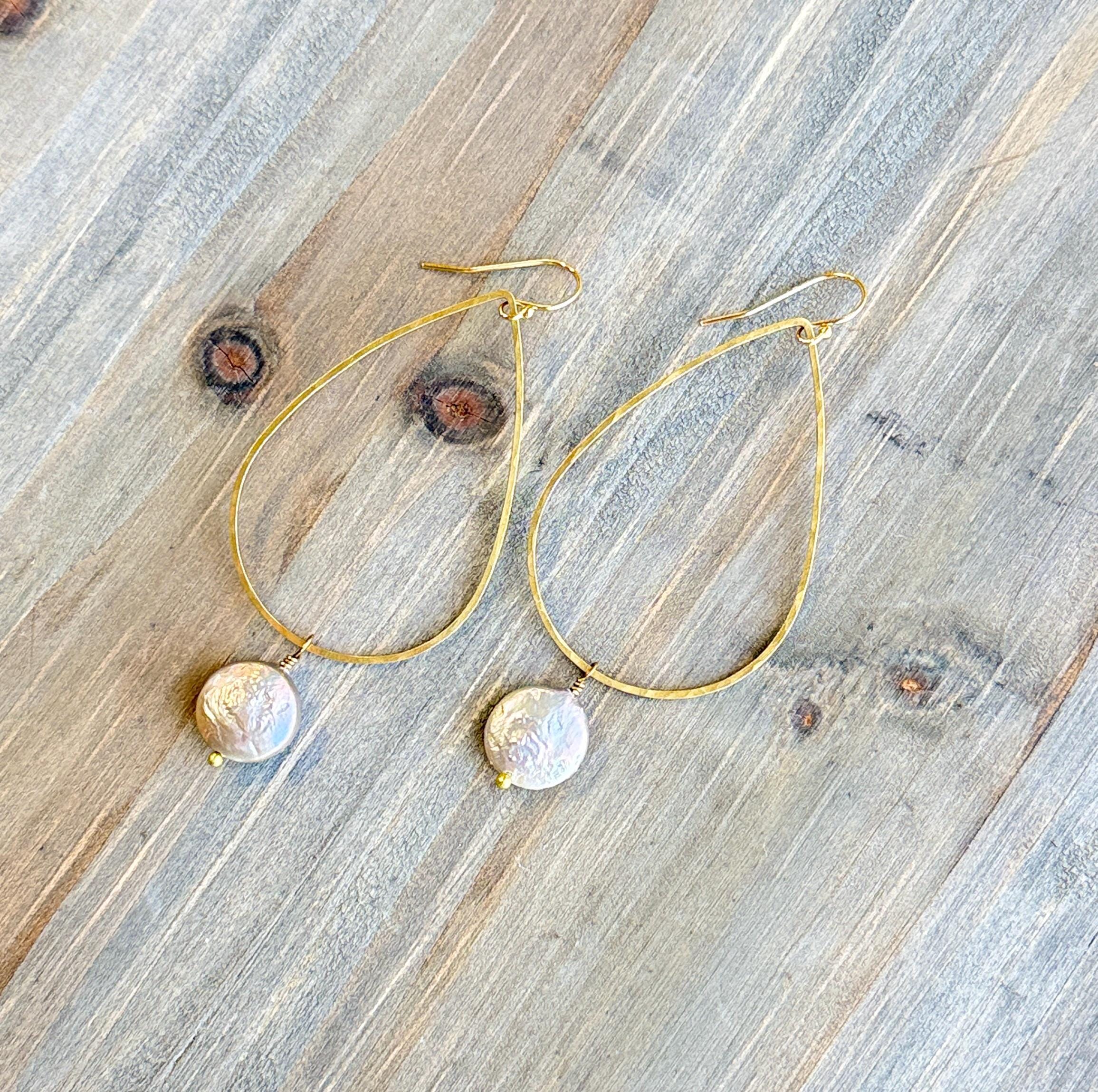 Pearl, Brass, and 14k Gold Filled Teardrop Earrings