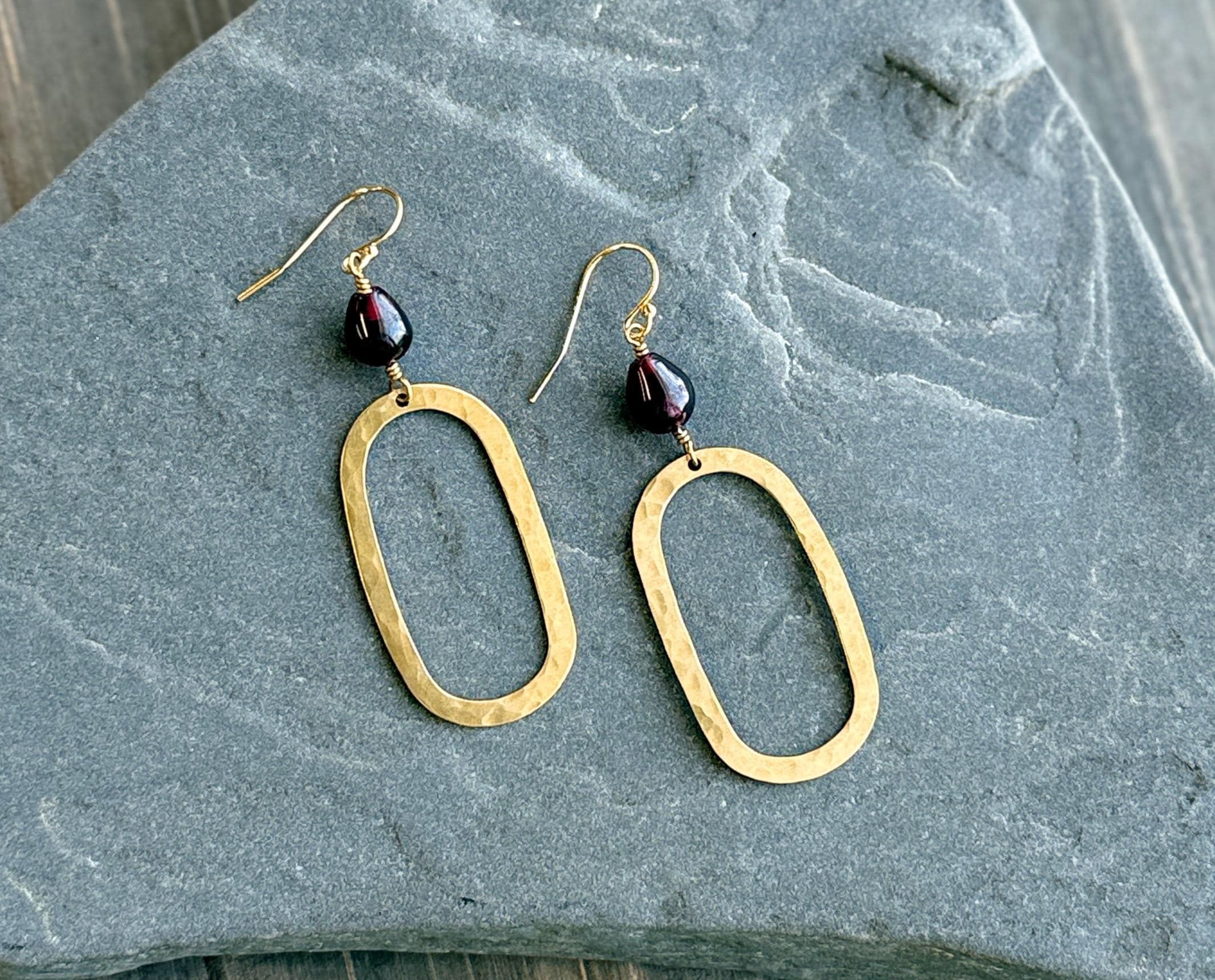 Lightly hammered oval loop earrings with beautiful natural dark red Garnet stones. Elegant, simple dark red stones and brass hammered ovals. These dangle from 14k gold filled hooks. Easy to wear and gift.