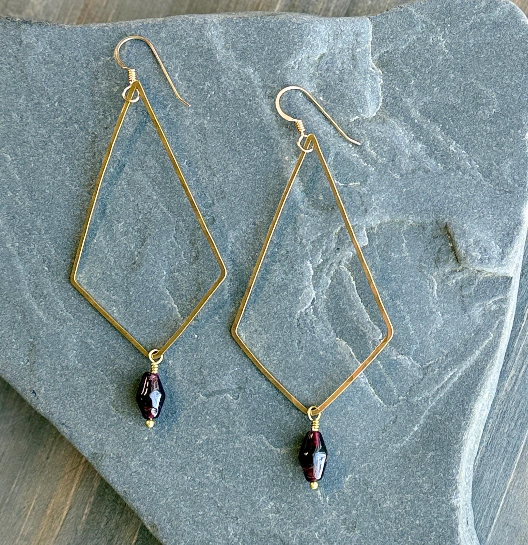 Garnet, Brass, and 14k Gold Filled Diamond Shaped Earrings