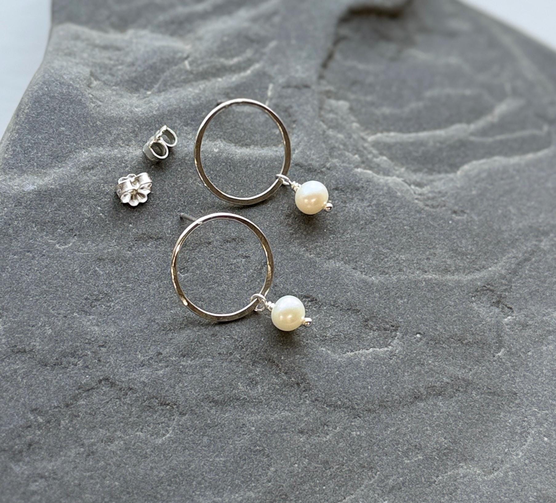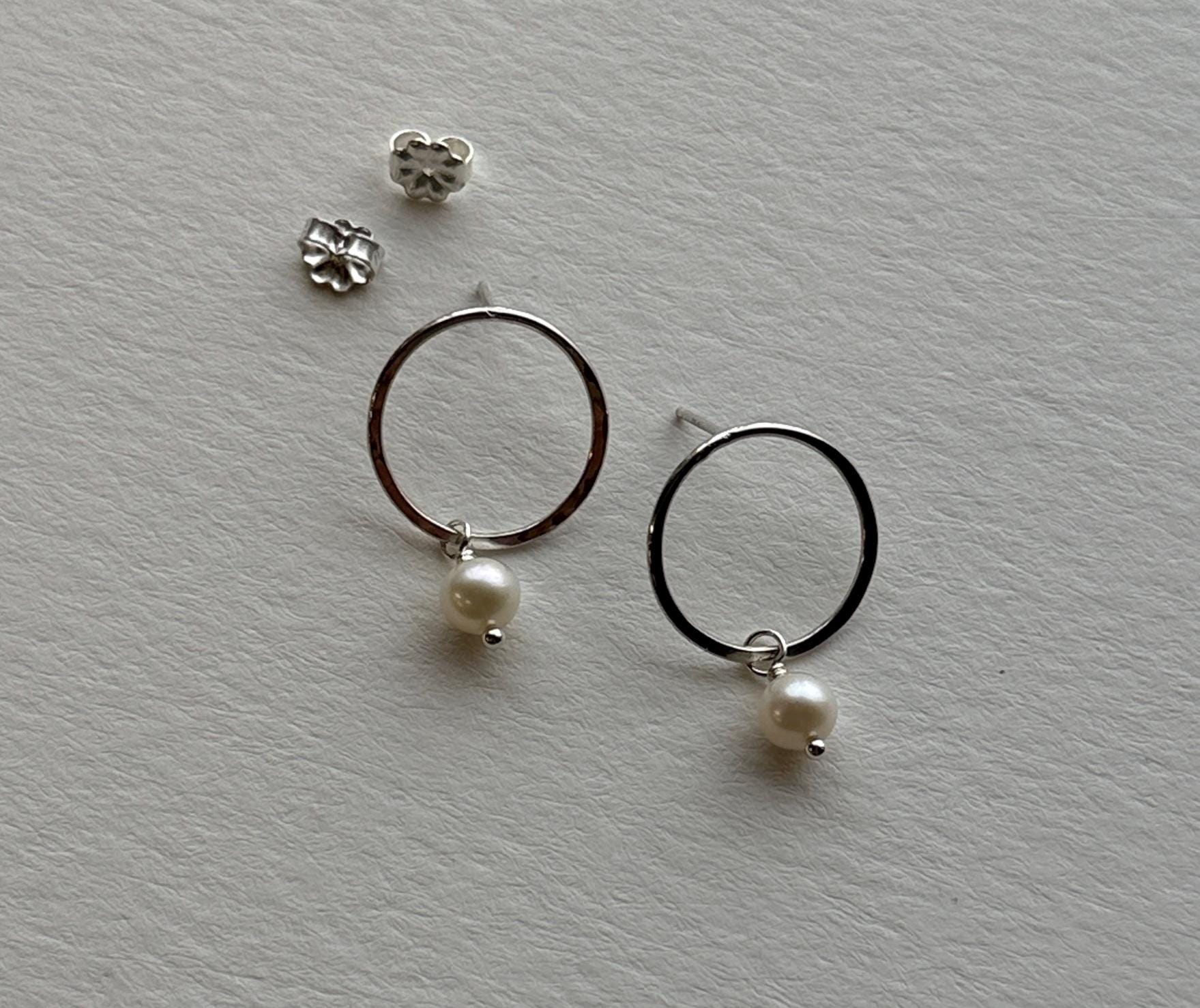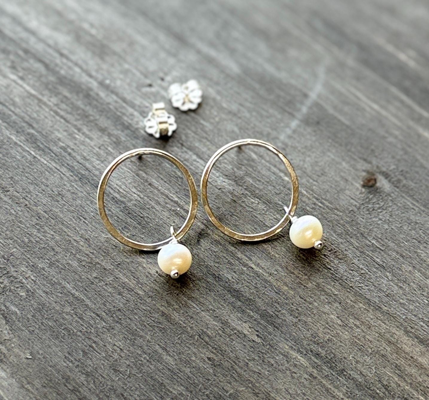These lightly hammered open circle sterling silver post earrings are softly textured, and feature natural freshwater pearls. They are about an inch long, and 6/8 of an inch wide. Perfect for keeping or gifting - pearl is the June birthstone, so these are ideal for a June birthday gift!