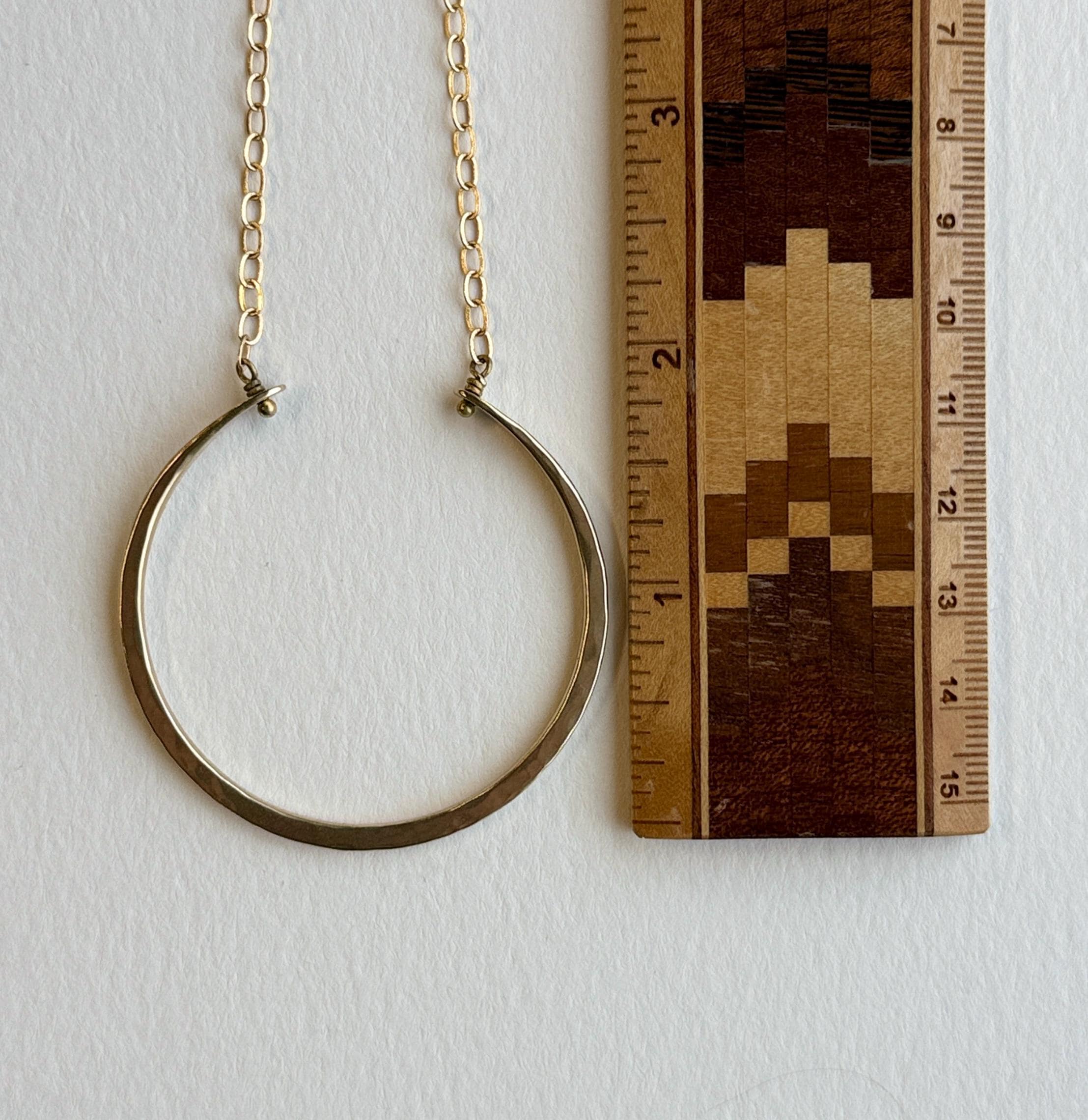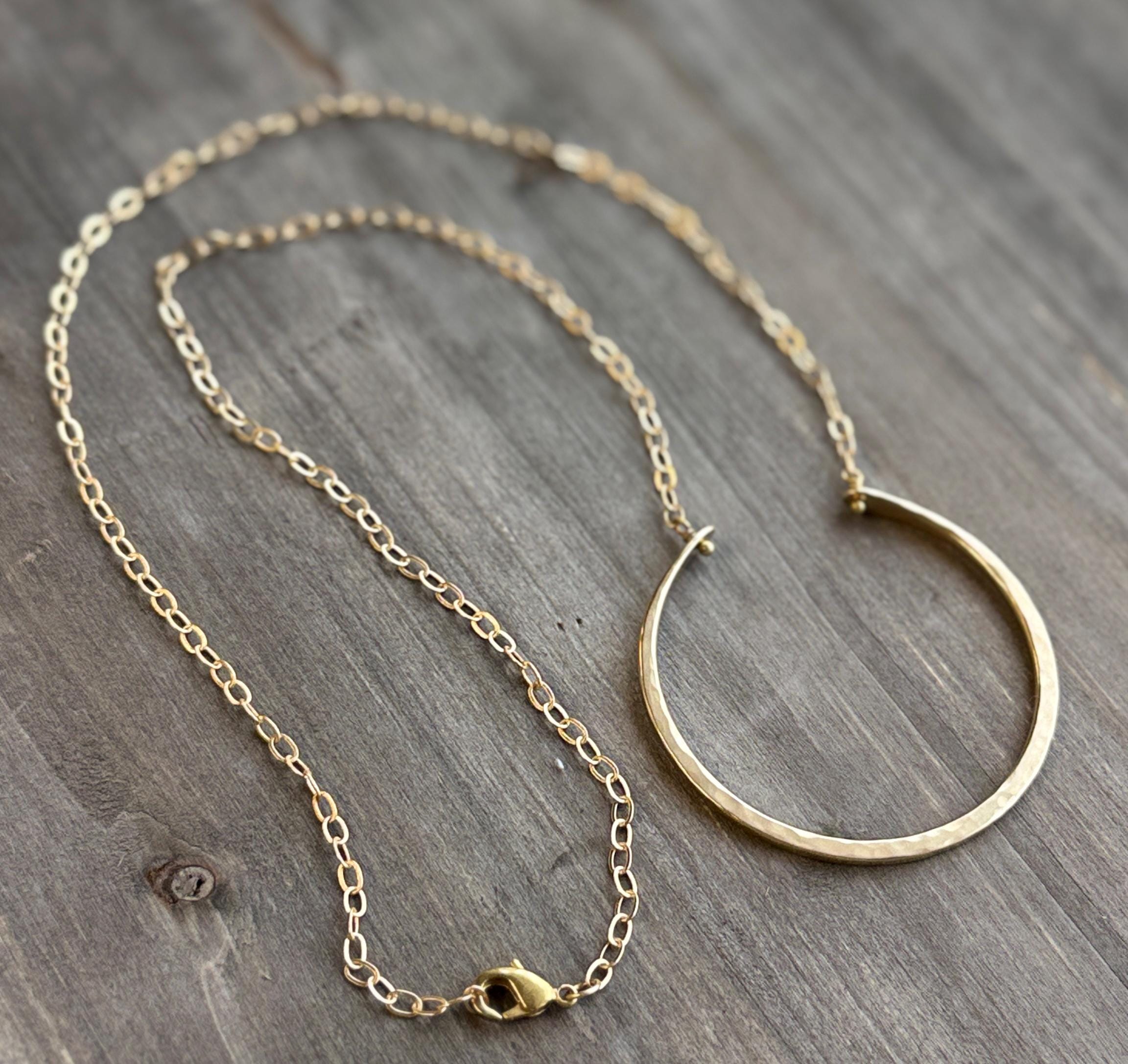 I handmade these necklaces by cutting and hammering brass wire to create this open circle necklace. It is made entirely by hand in all brass with a soft hammered texture. Every necklace is unique and one of a kind. The pendant is about 2 inches in diameter. Please note that the lengths listed represent the maximum length, but all variations can be worn shorter than this. The clasp fits into the chain links, so you can adjust the length to accommodate your preference.