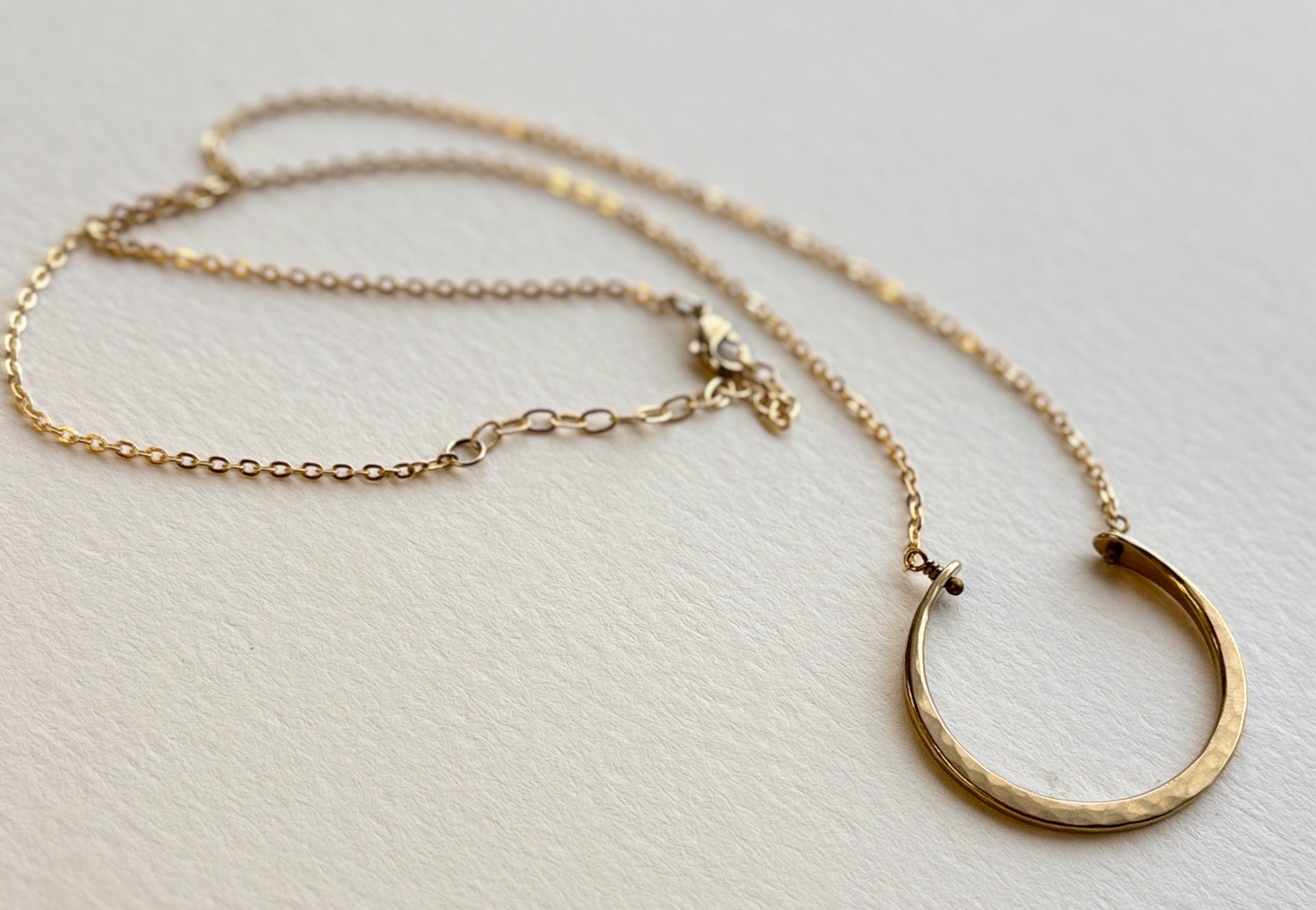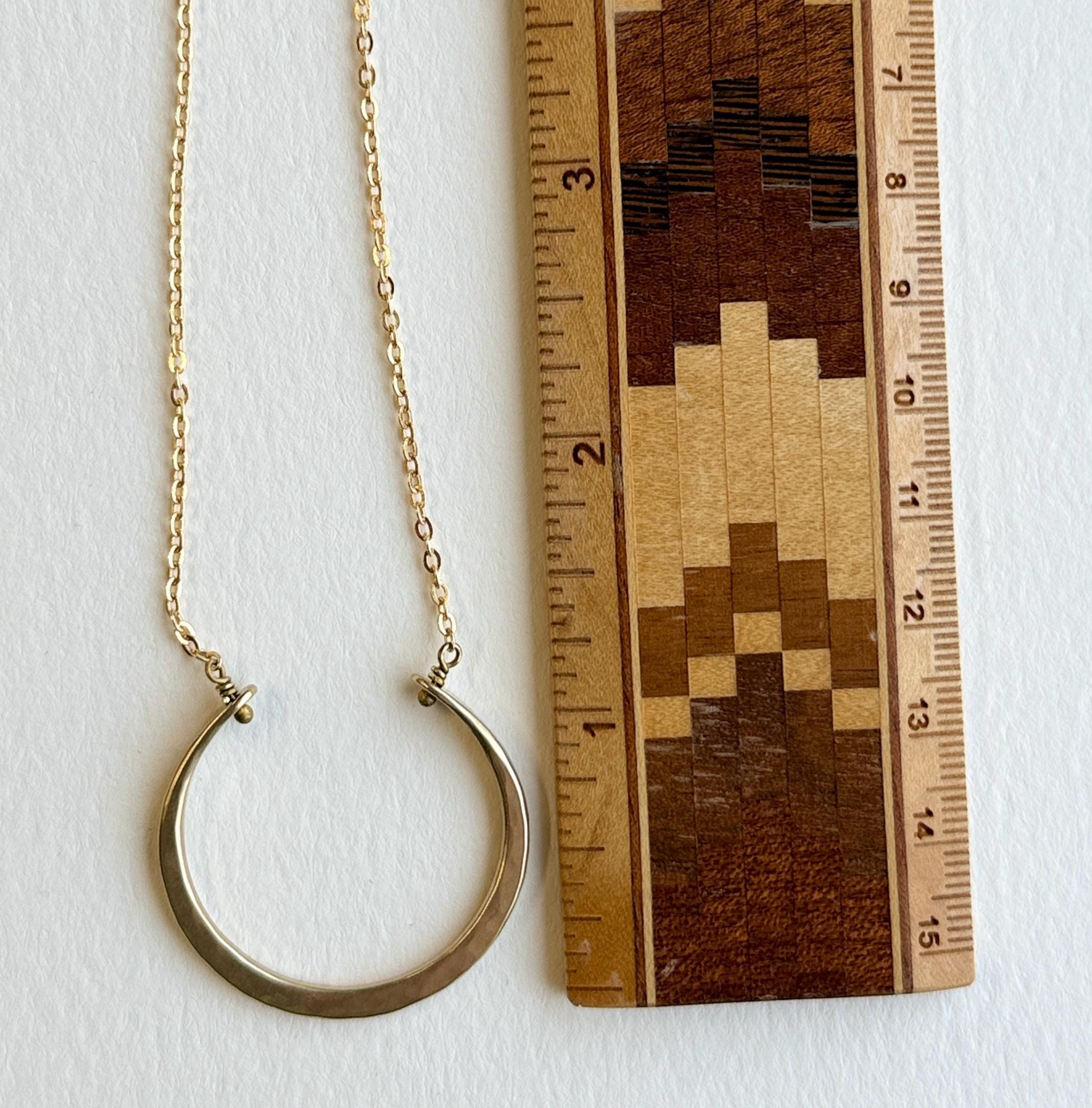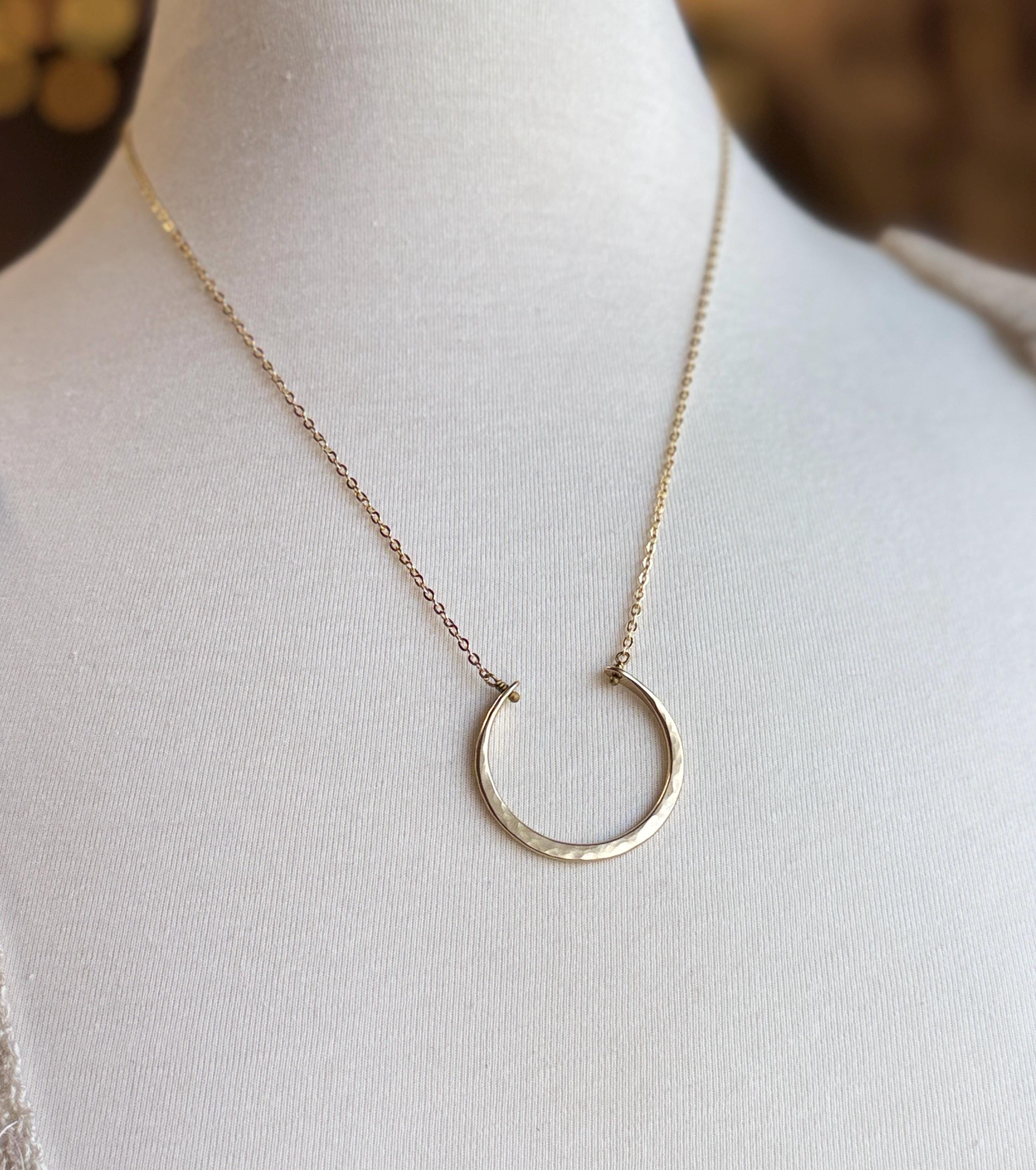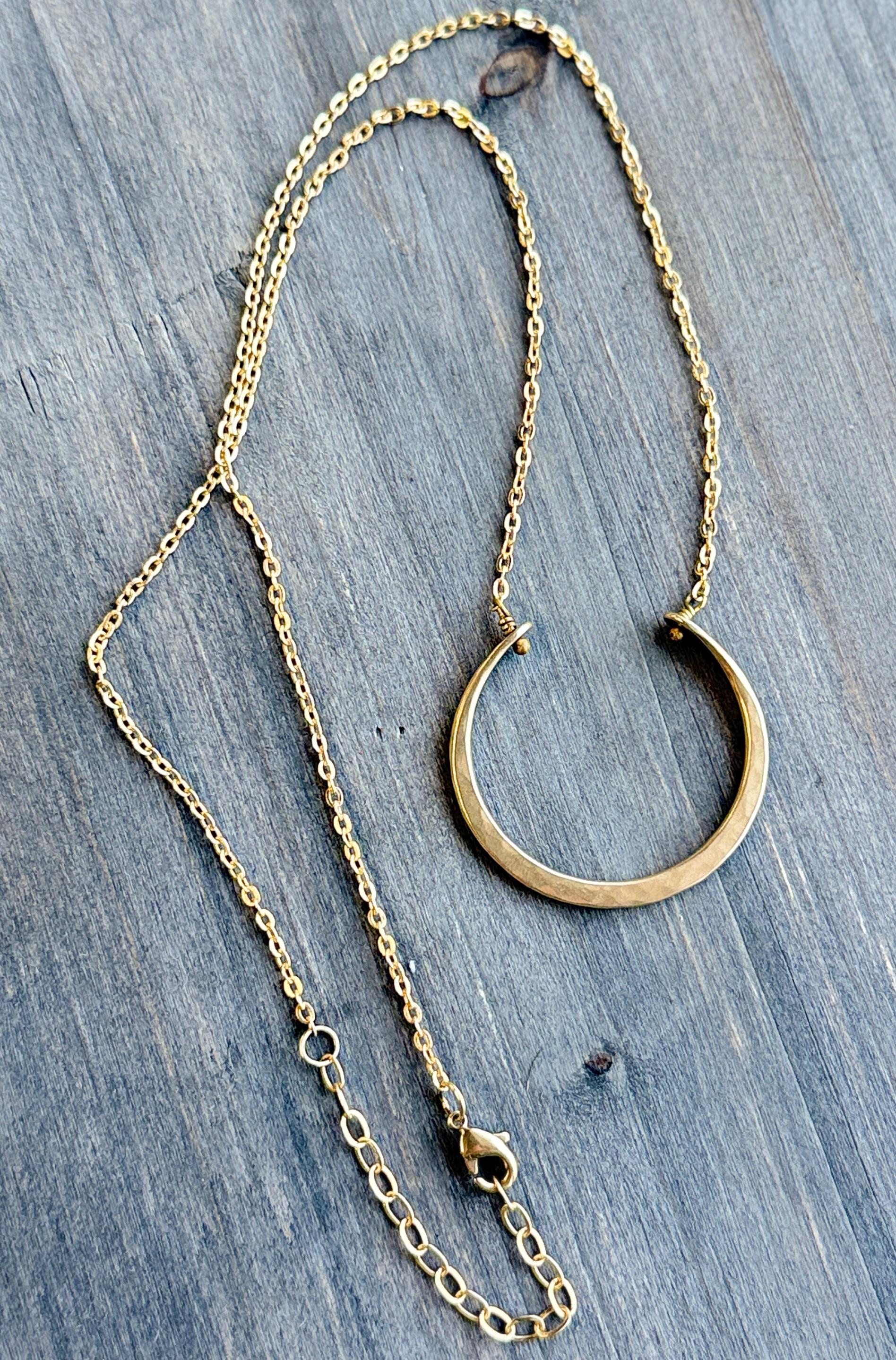 I handmade these necklaces by cutting and hammering brass wire to create this open circle necklace. It is made entirely by hand in all brass with a soft hammered texture. Every necklace is unique and one of a kind. The pendant is about 1 inch in diameter.