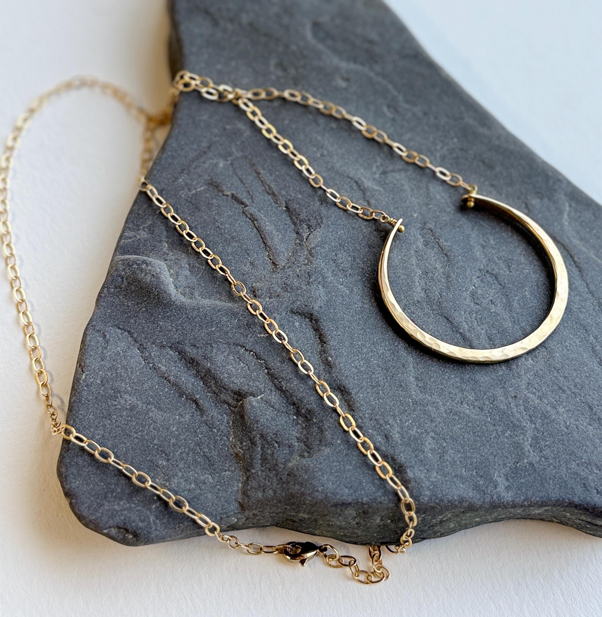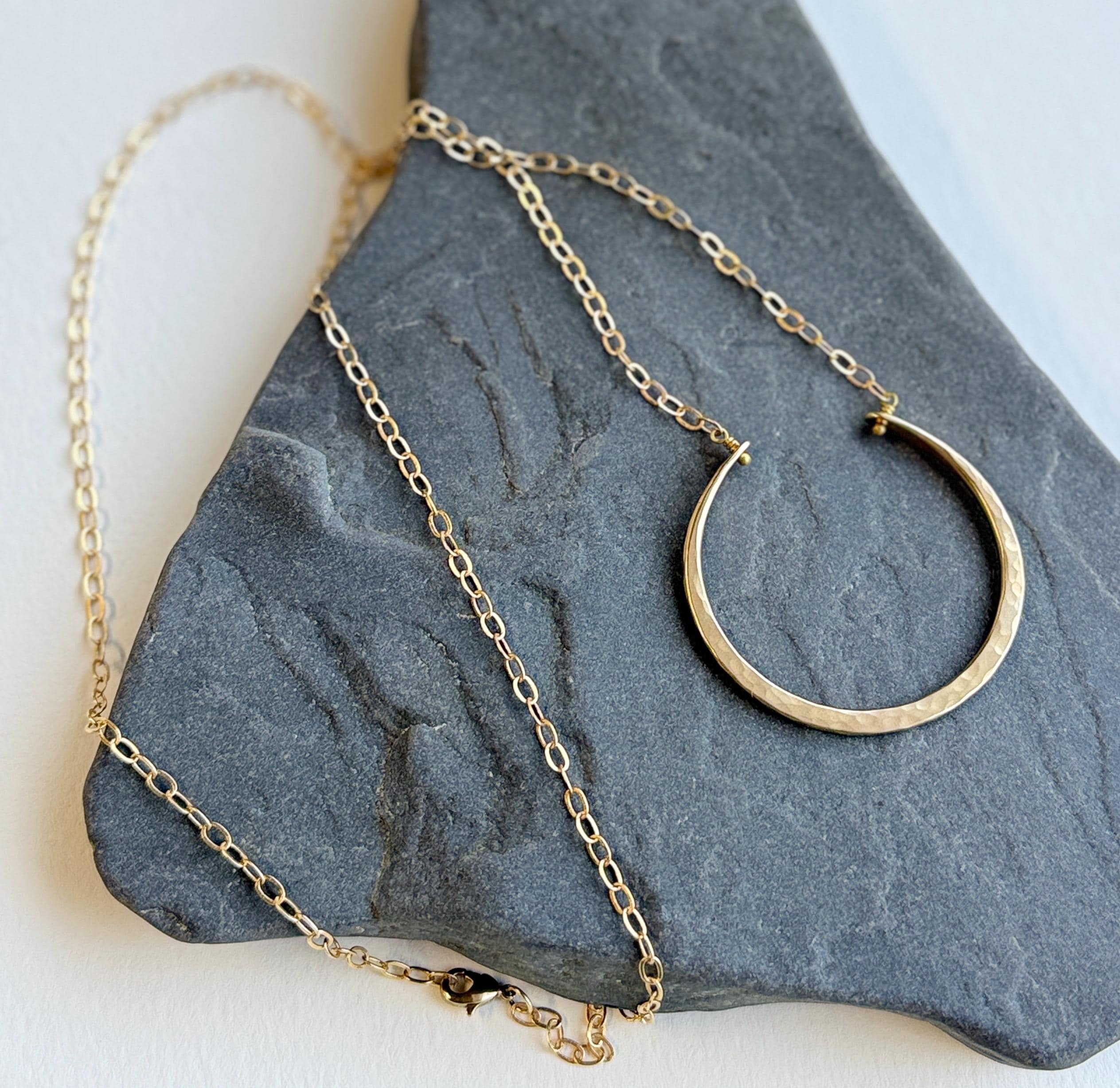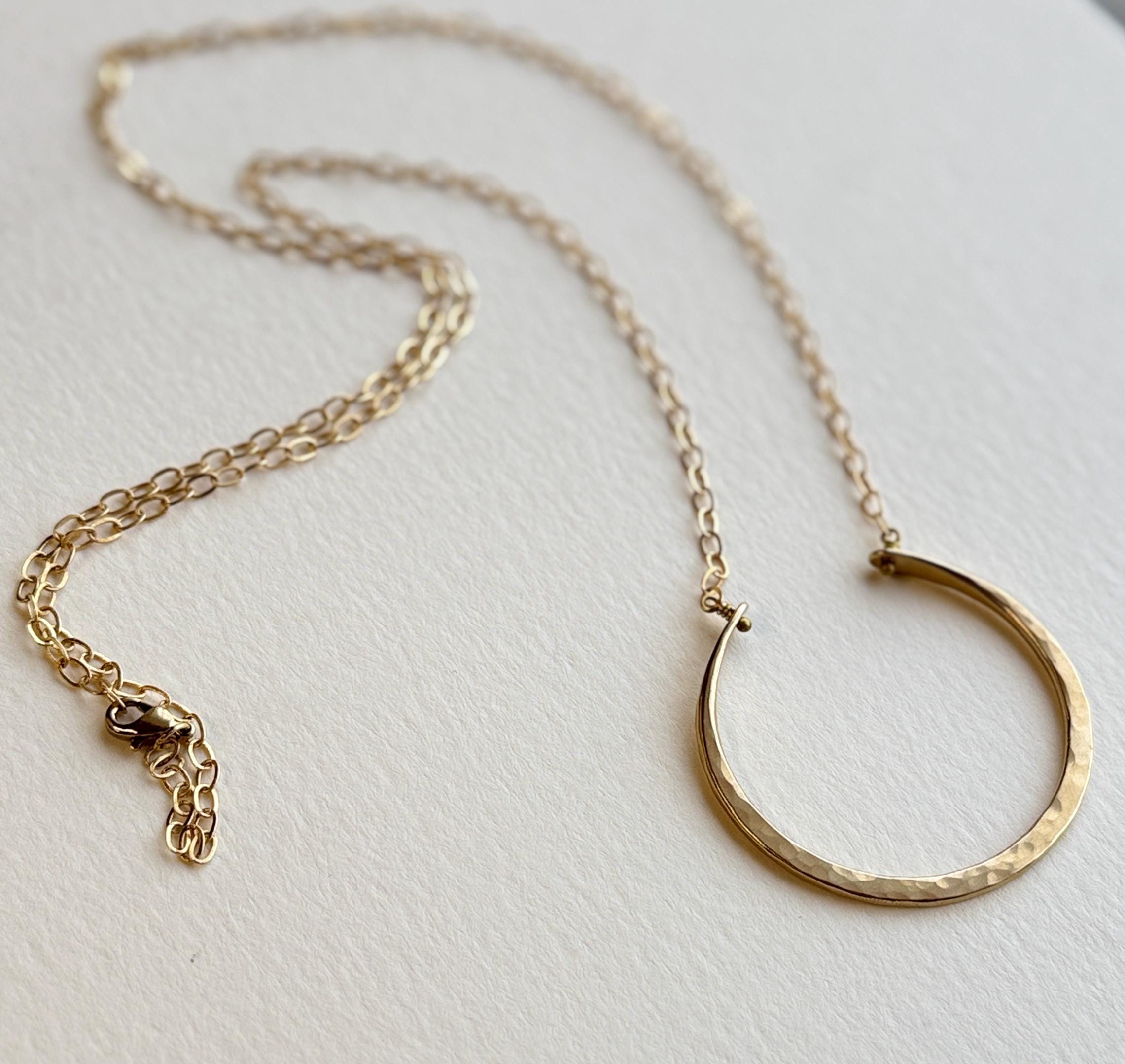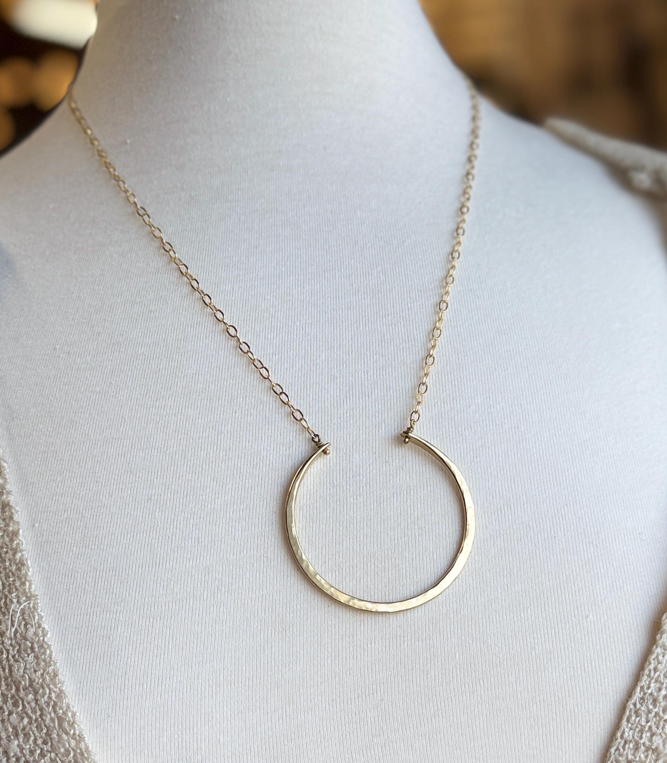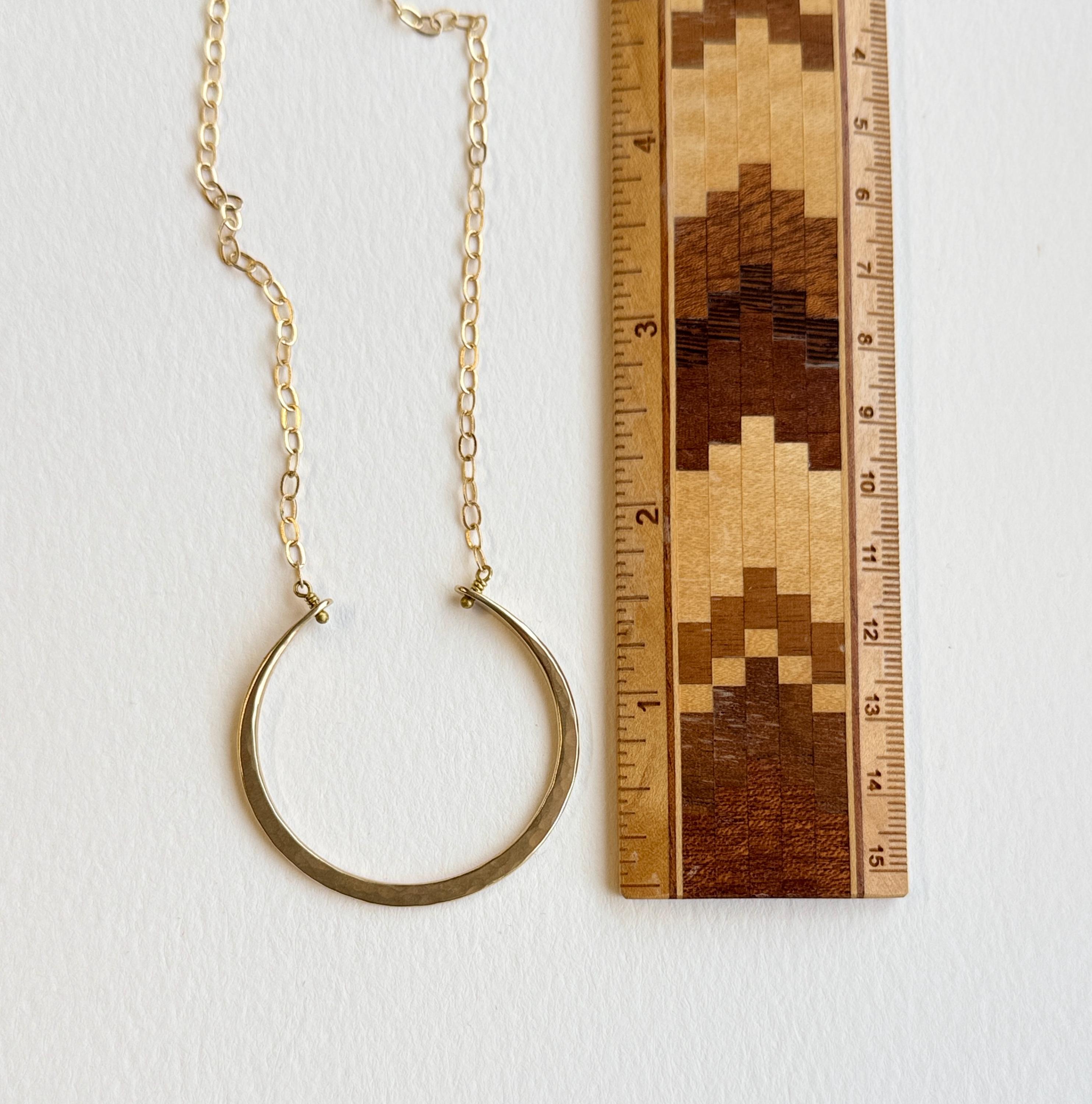I handmade these necklaces by cutting and hammering brass wire to create this open circle necklace. It is made entirely by hand in all brass with a soft hammered texture. Every necklace is unique and one of a kind. The pendant is about 1.5 inches in diameter. Please note that the lengths listed represent the maximum length, but all variations can be worn shorter than this. The clasp fits into the chain links, so you can adjust the length to accommodate your preference.