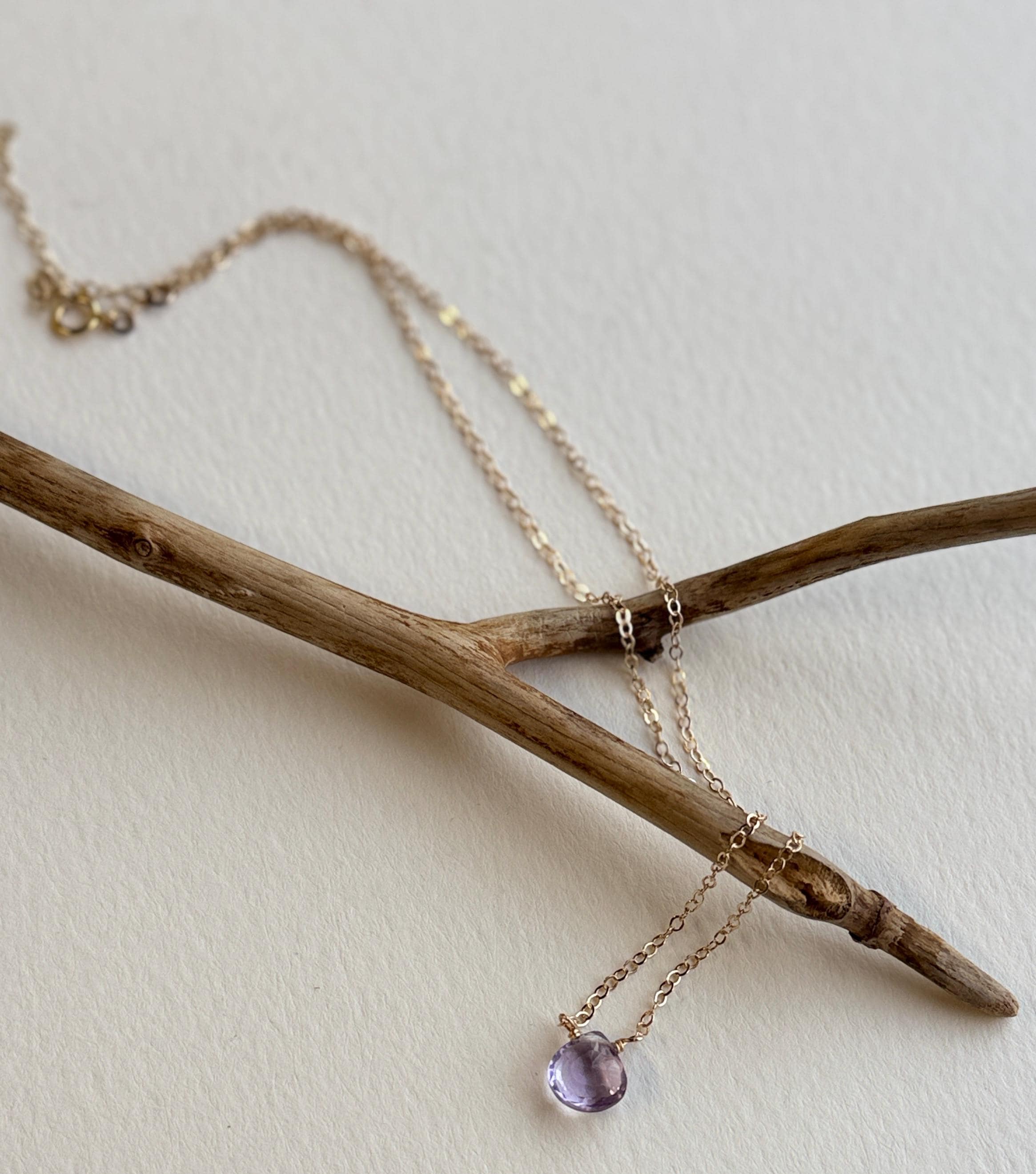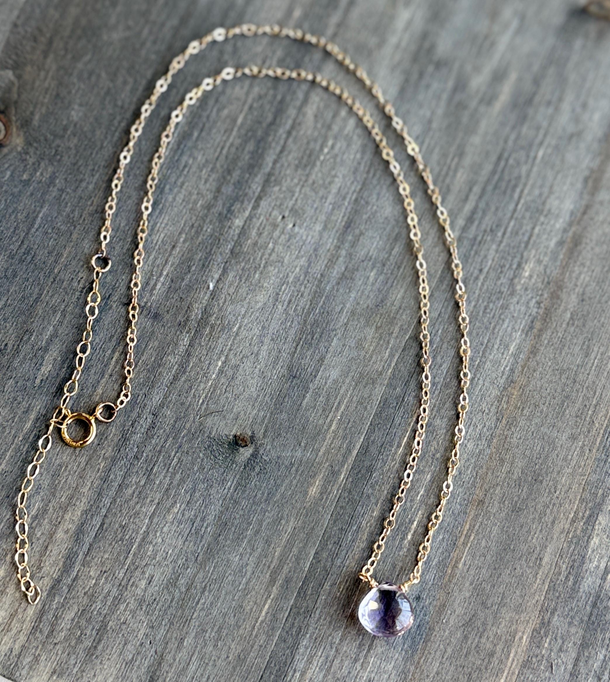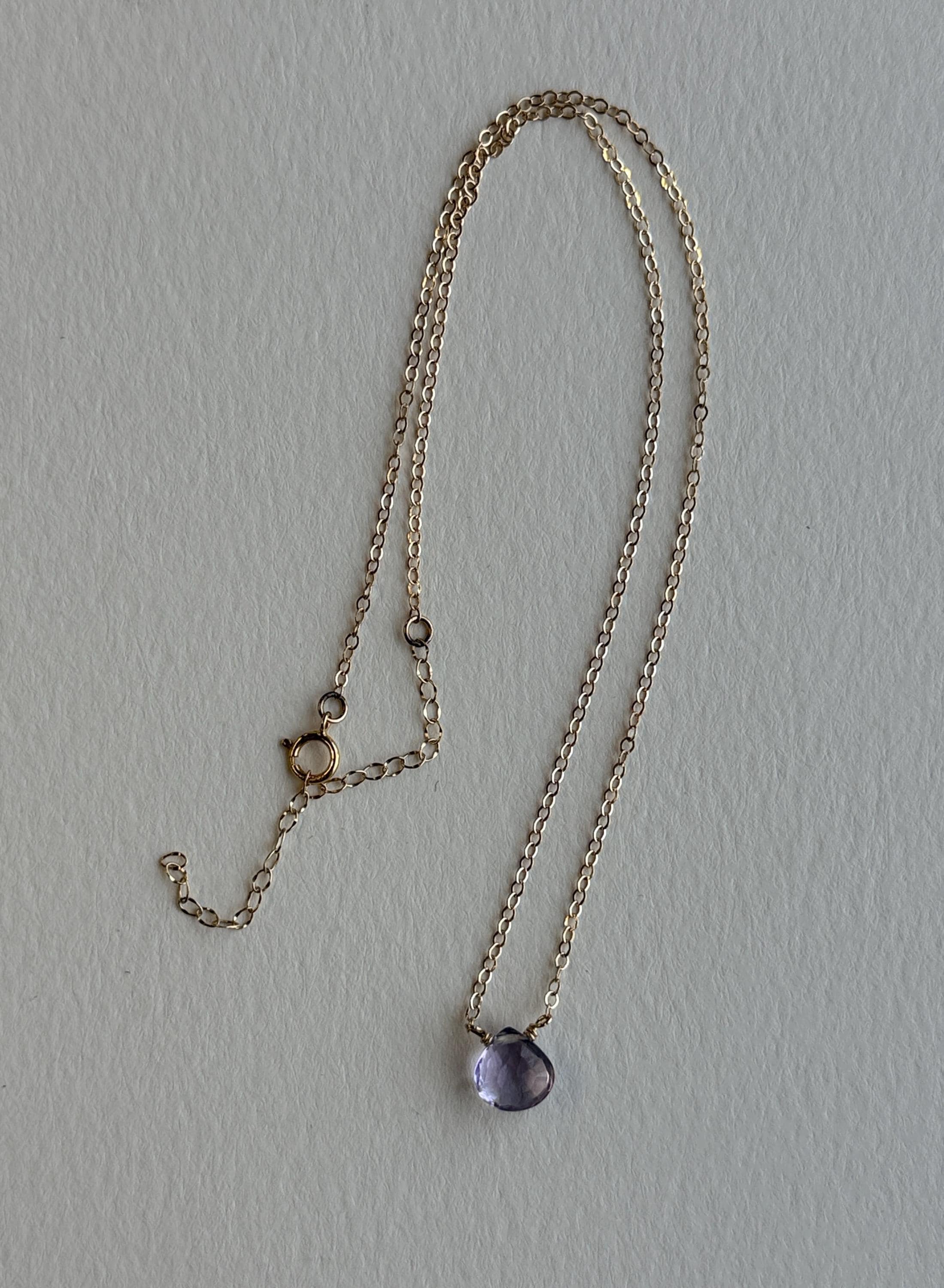This delicate necklace features a 16-18 inch 14k gold filled chain, and a natural faceted amethyst gemstone. These colorful purple stones are teardrop shaped, and as they are natural and un-dyed, they have marks and inclusions that may vary slightly. Amethyst is the birthstone of February - perfect for gifting!