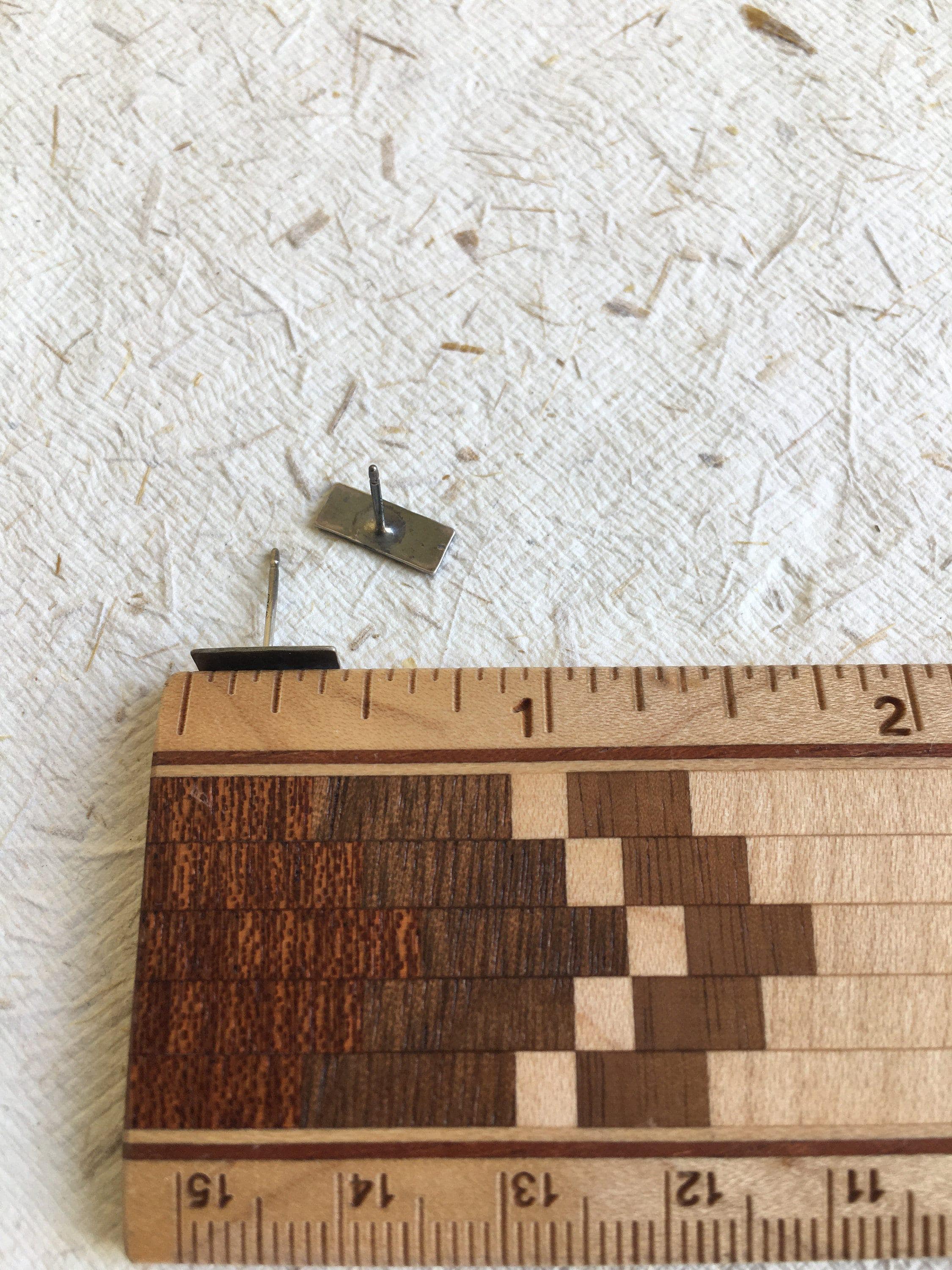 These are solid Sterling silver rectangle post earrings. They are oxidized for a shiny dark gre/ blackish look. This will weather and change very slightly over tie with use.