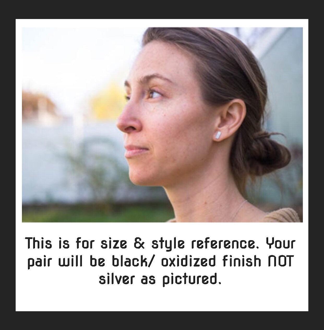 *Please note, the pair photographed on model is for size reference only. Your pair will be the same style and size but in the black, oxidized finish.