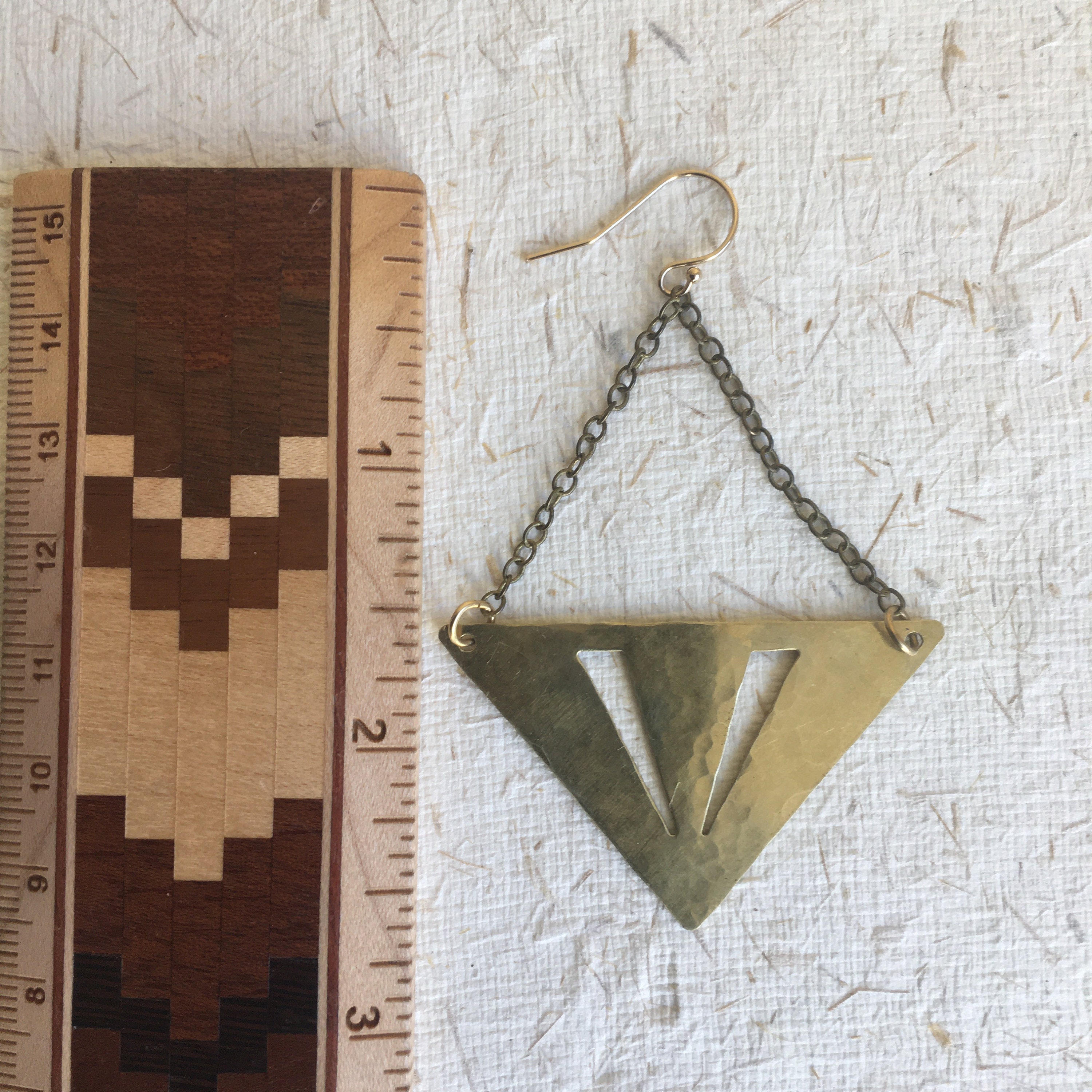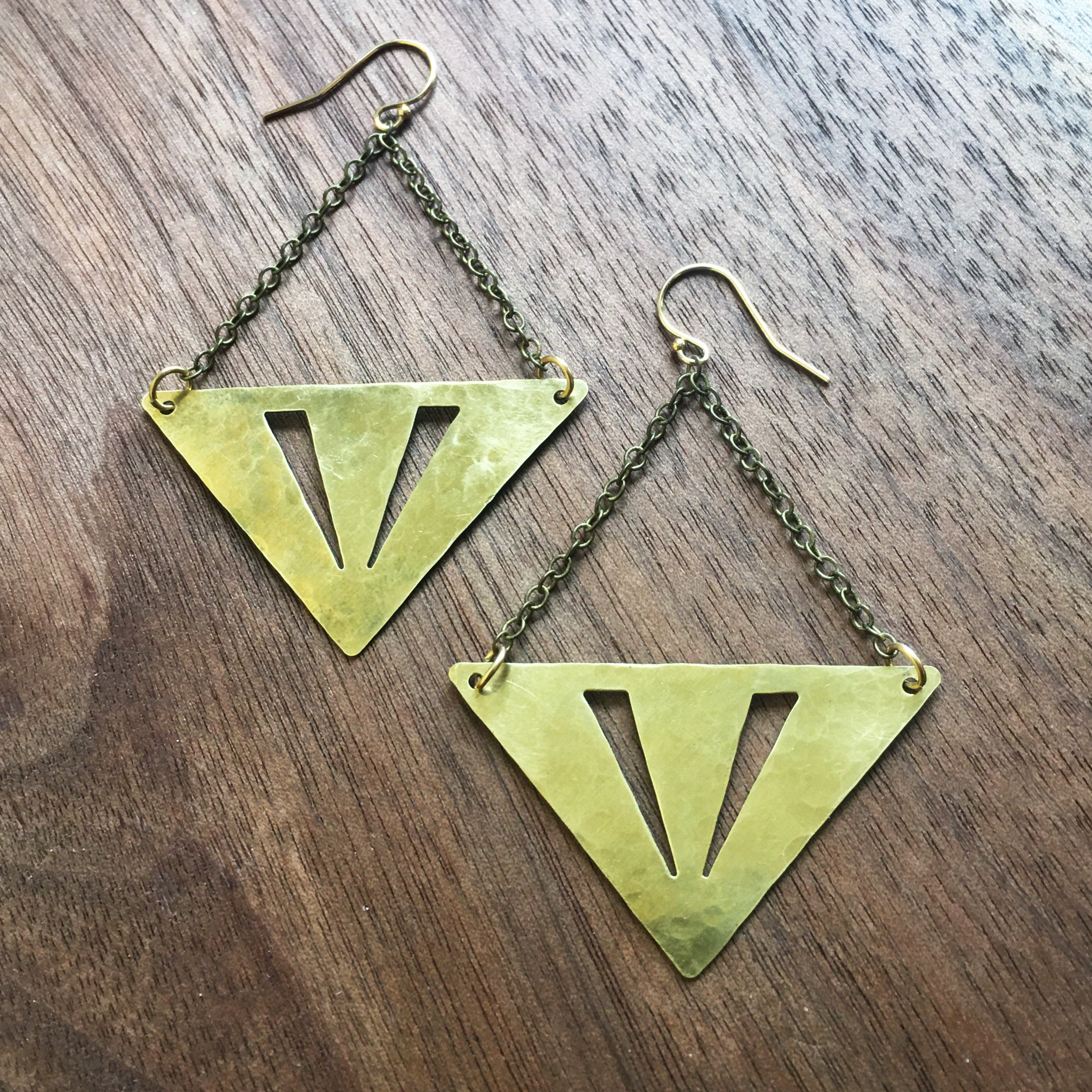 These are made with hammered brass triangles with cut out shapes. These hang from brass chain trapeze style with 14k gold fill hooks.