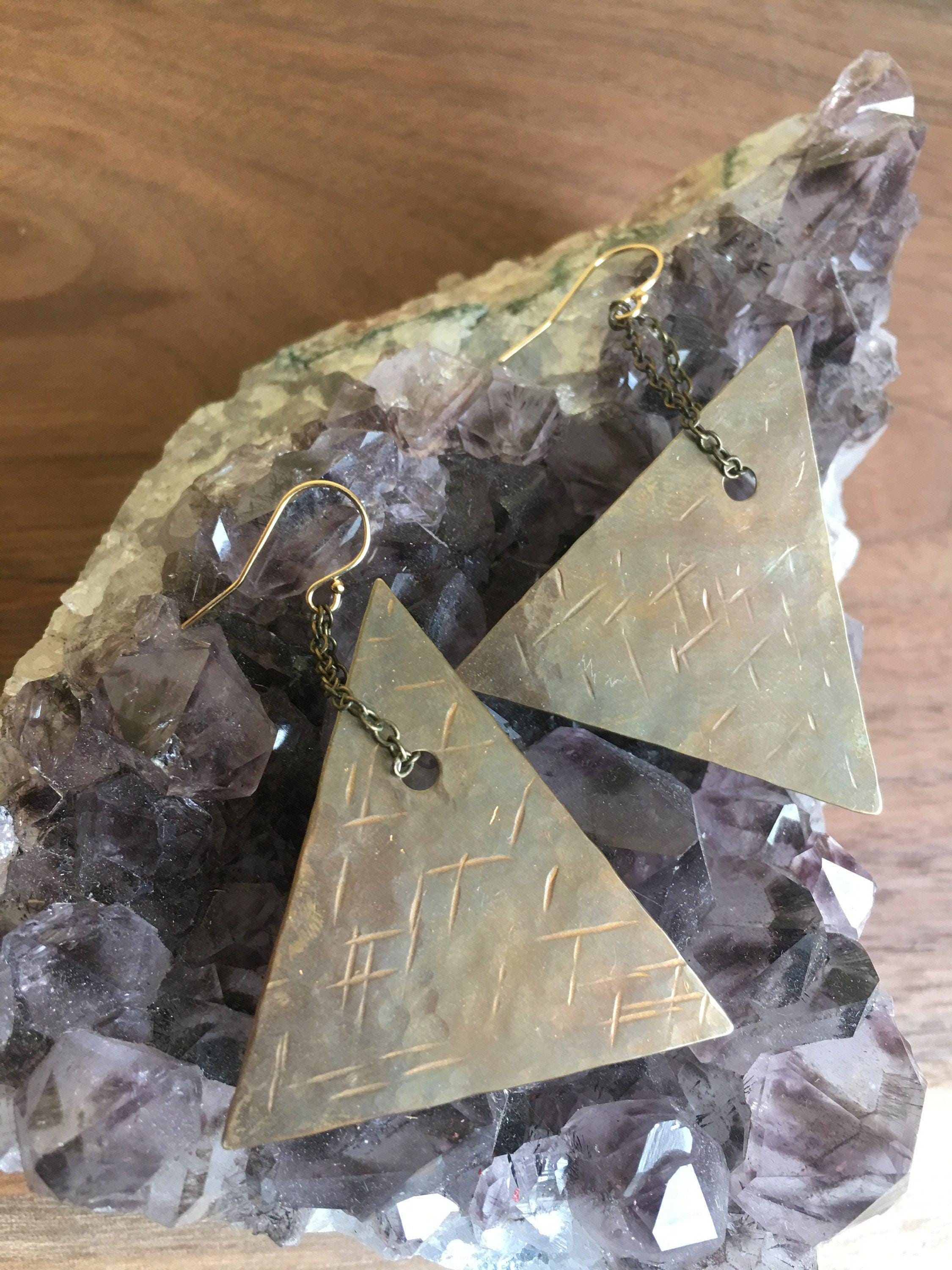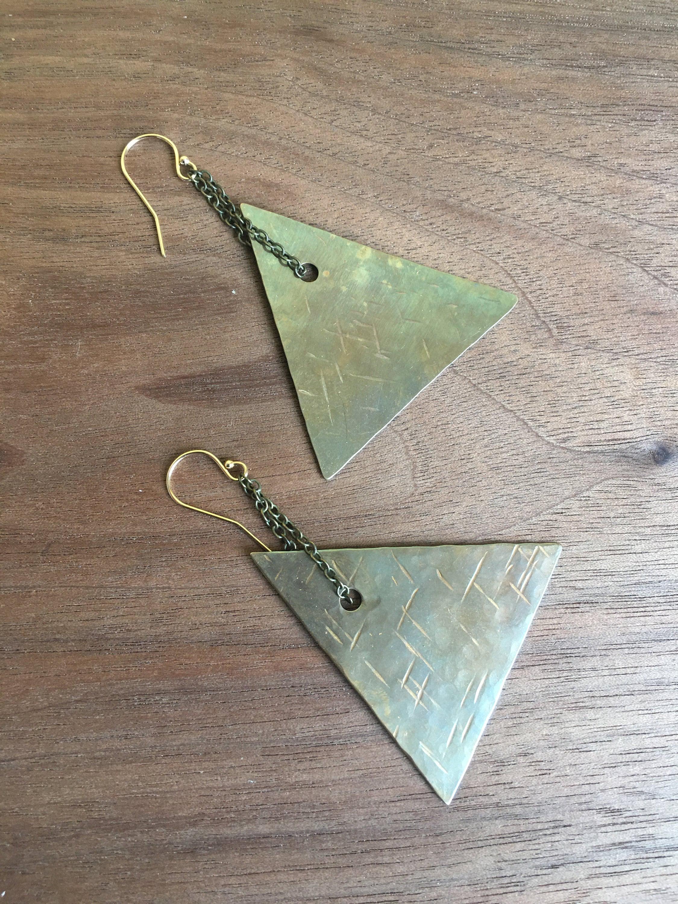 Triangle Brass Earrings, Chain Dangling Earrings, Textured Brass Jewelry