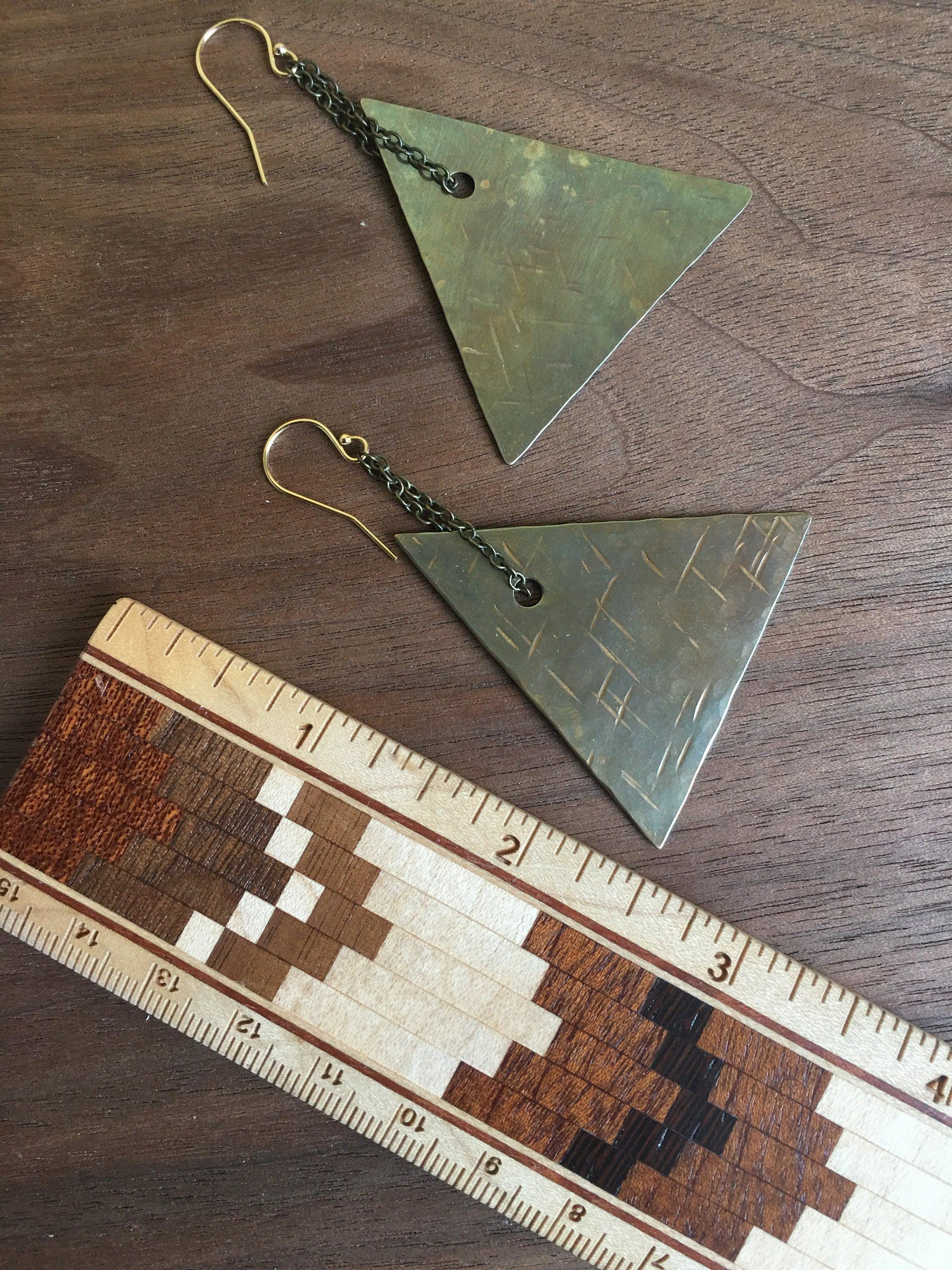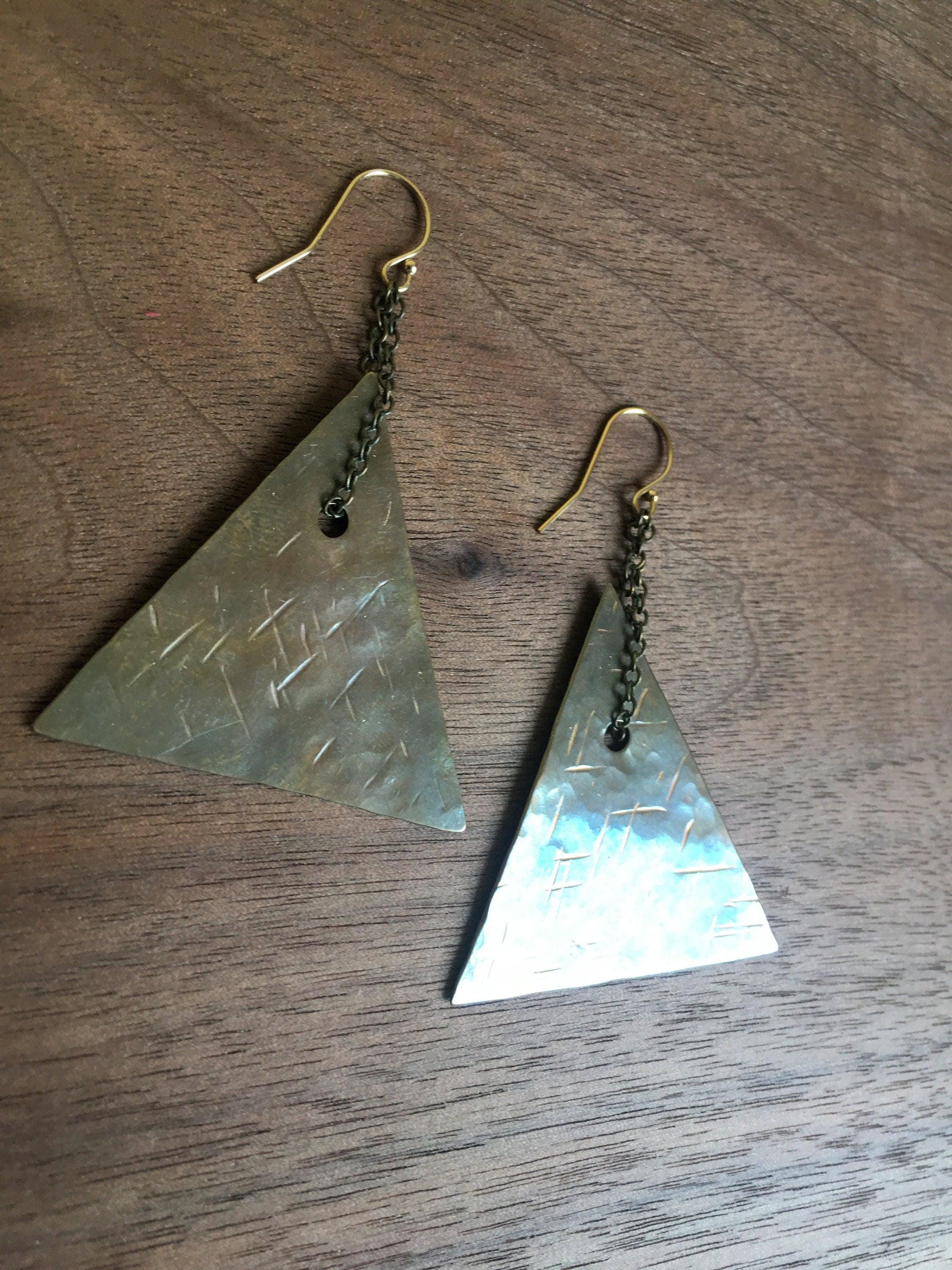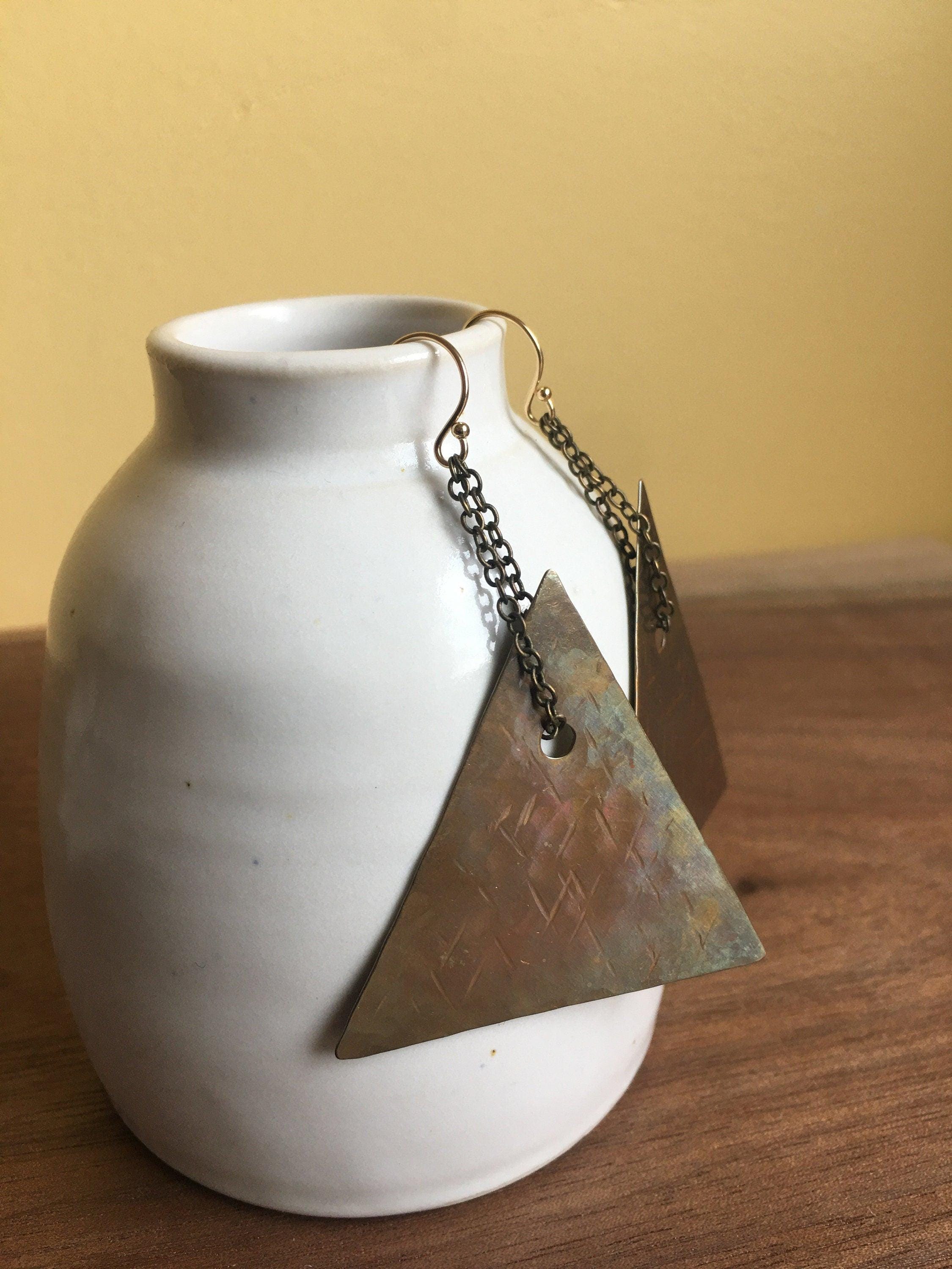 Beautiful handmade hammered brass Earrings are hand cut and hammered with a criss cross texture. These are solid brass triangles that have been patinad to a dark rich bronze color. I make these by hand drilling, hammering and forging out brass. They hang on Brass chain from 14k gold fill hooks. Each pair is handcrafted and so unique.