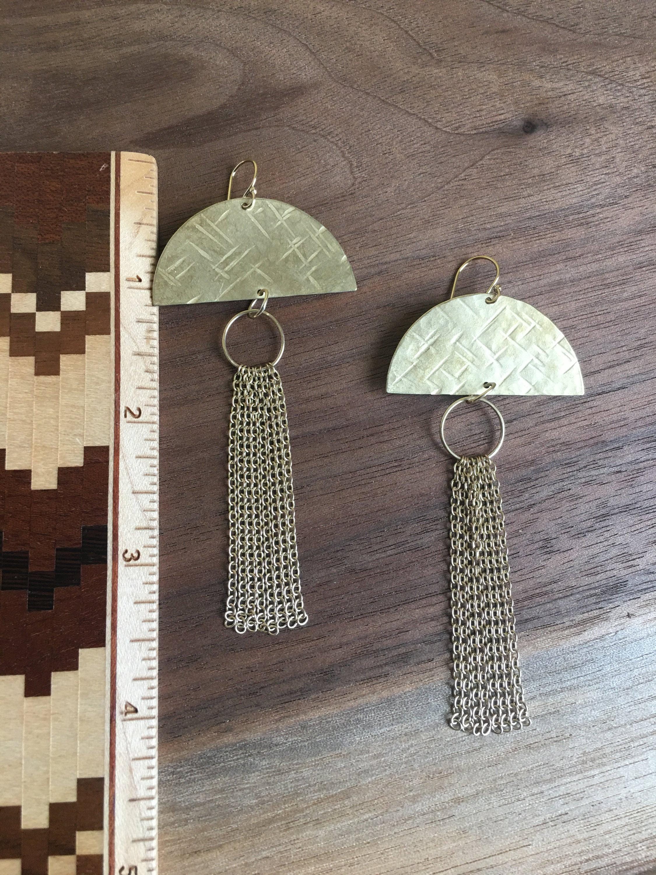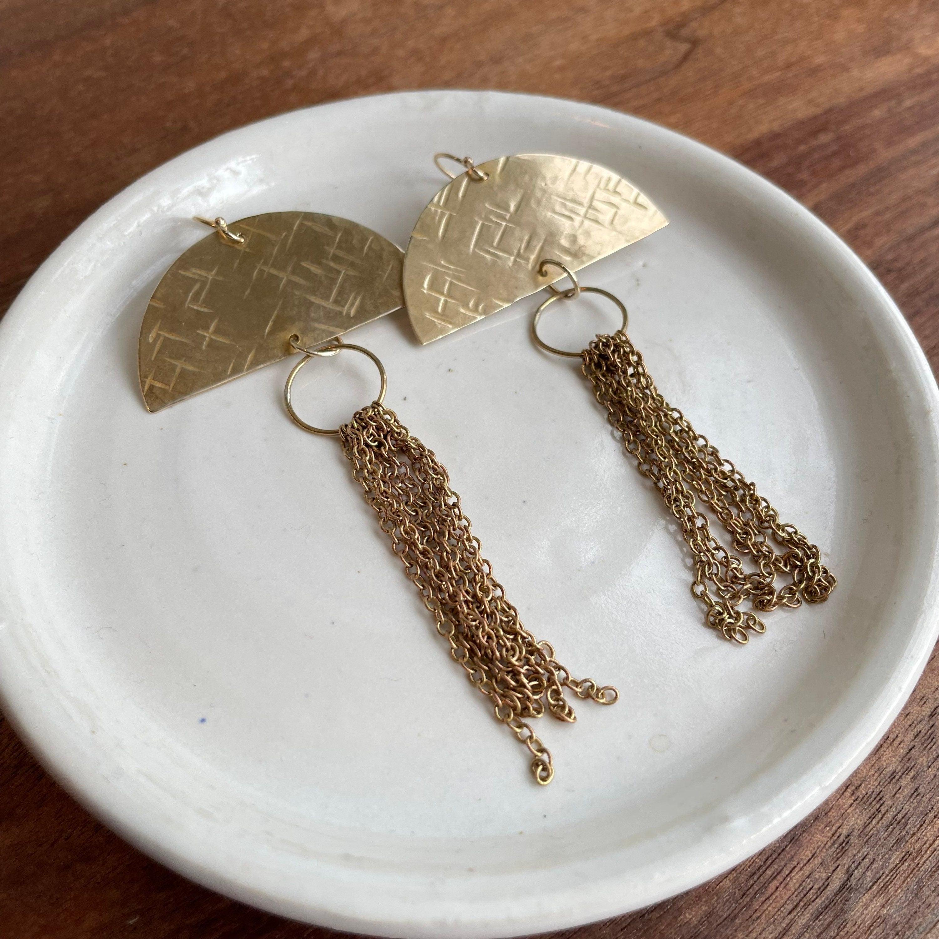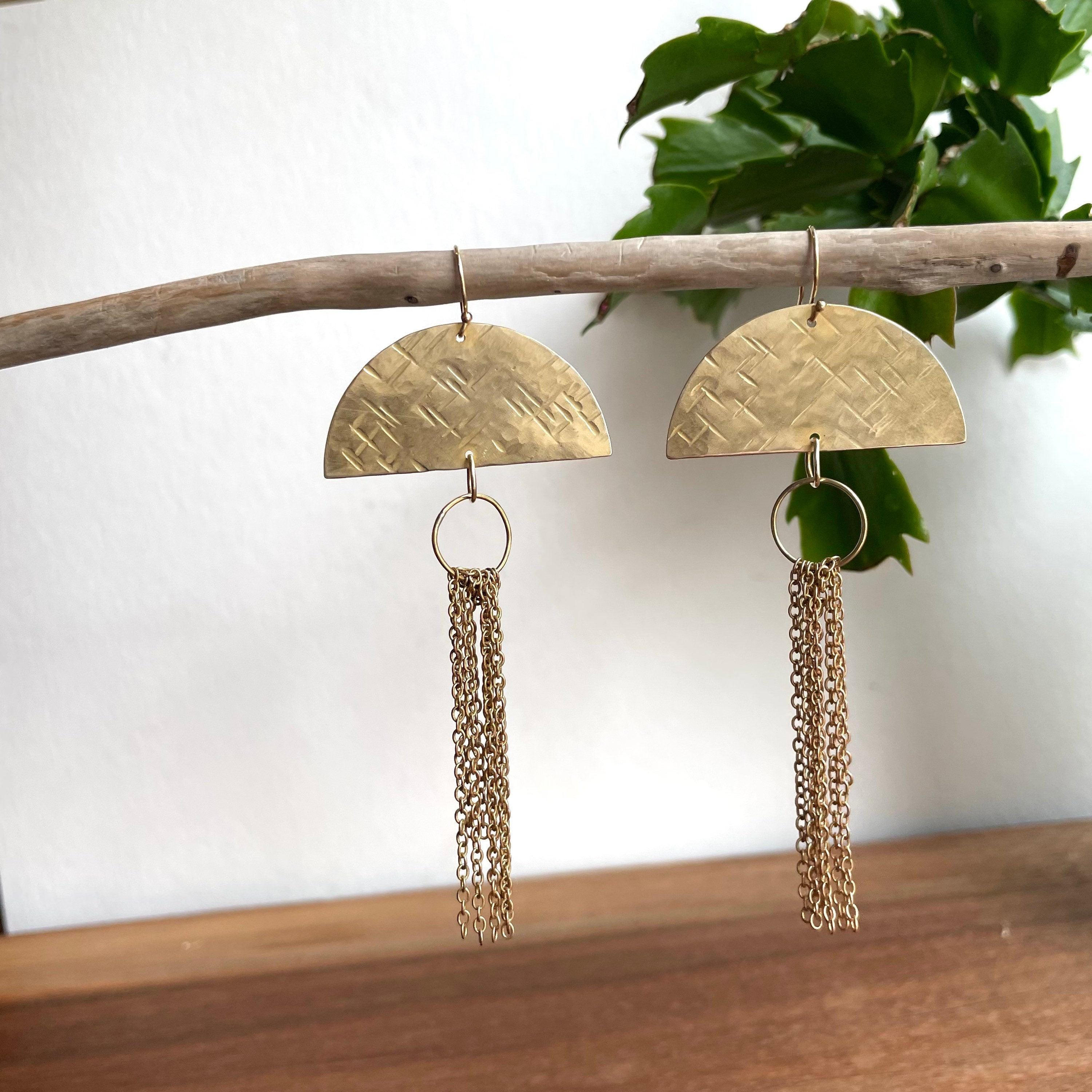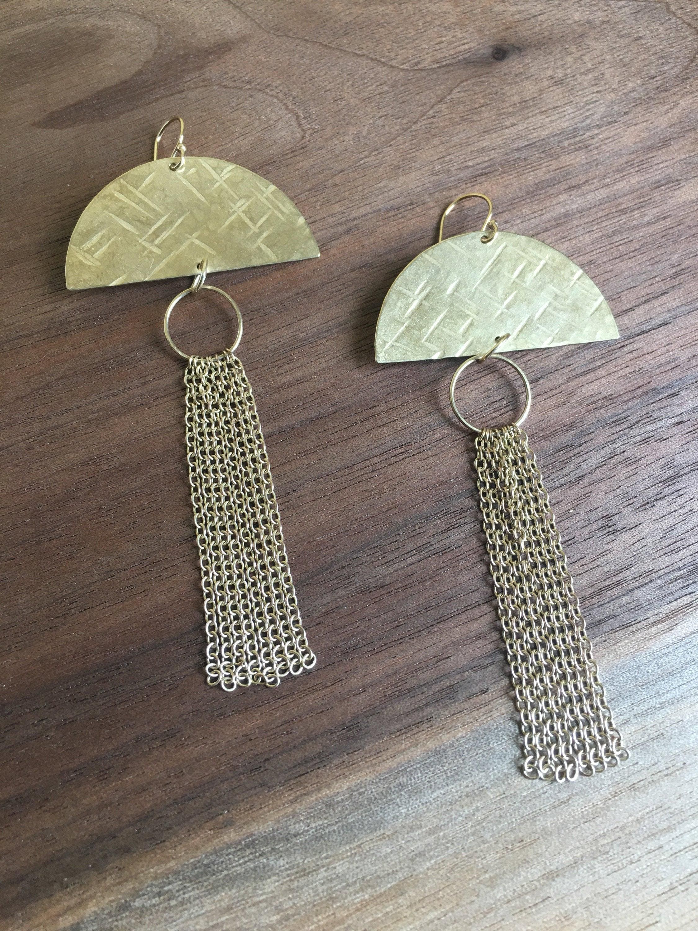 Beautiful handmade hammered brass Earrings are hand cut and hammered with a criss cross texture. These are solid brass half circles with a brass chain tassel. I call them Jellyfish earrings sometimes. I make these entirely by hand. They hang from 14k gold fill hooks. Each pair is handcrafted and so unique.