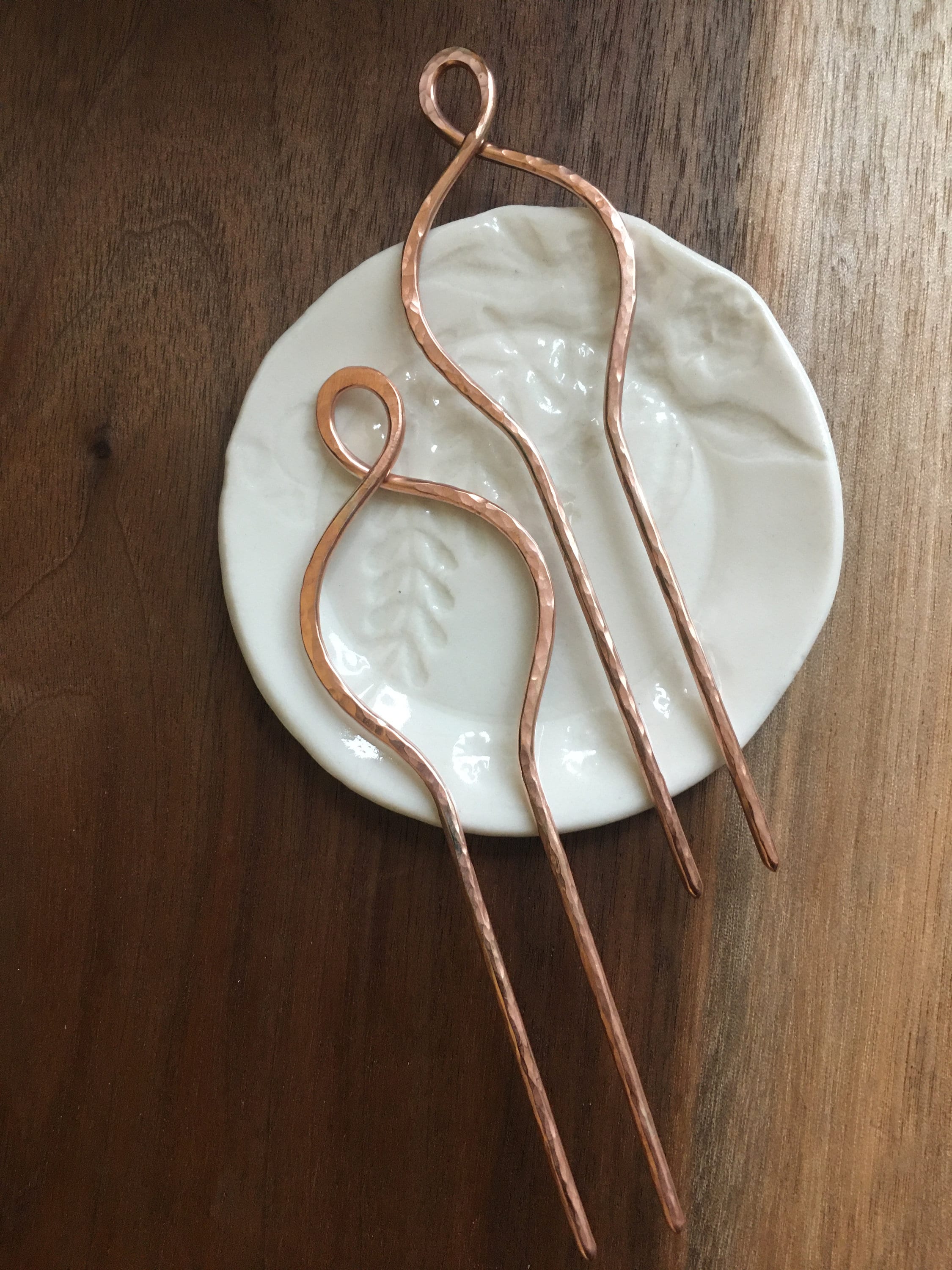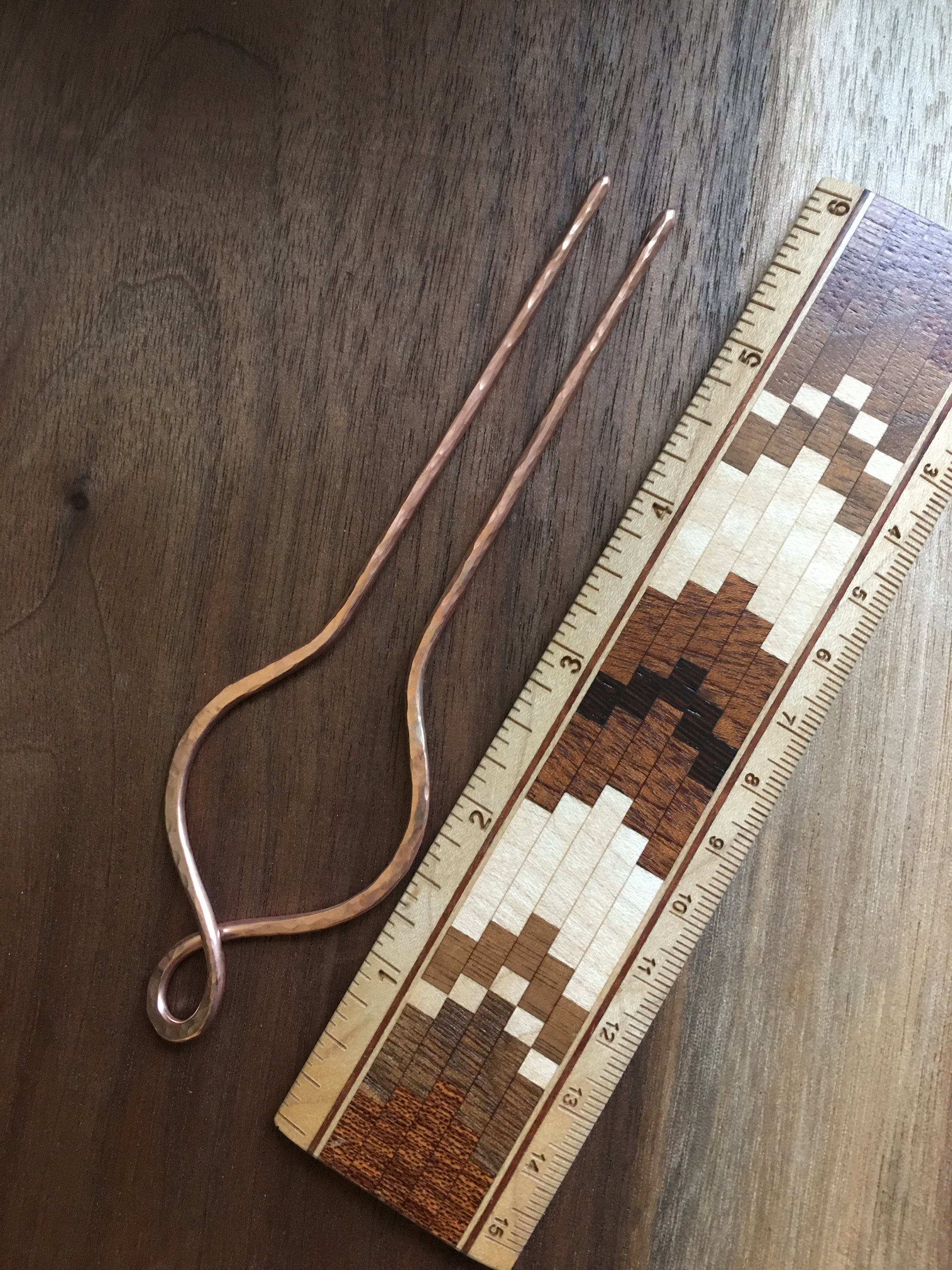 I make these hair sticks by hand from thick copper rods that I shape and hand hammer. These work well to keep your bun in place and show a pretty twist loop of hammered copper on the end. These are natural copper and the color will change/darken over time. Each pin comes with a polishing kit you can use to keep yours shiny if you wish. Each pin is handmade and so will vary slightly.