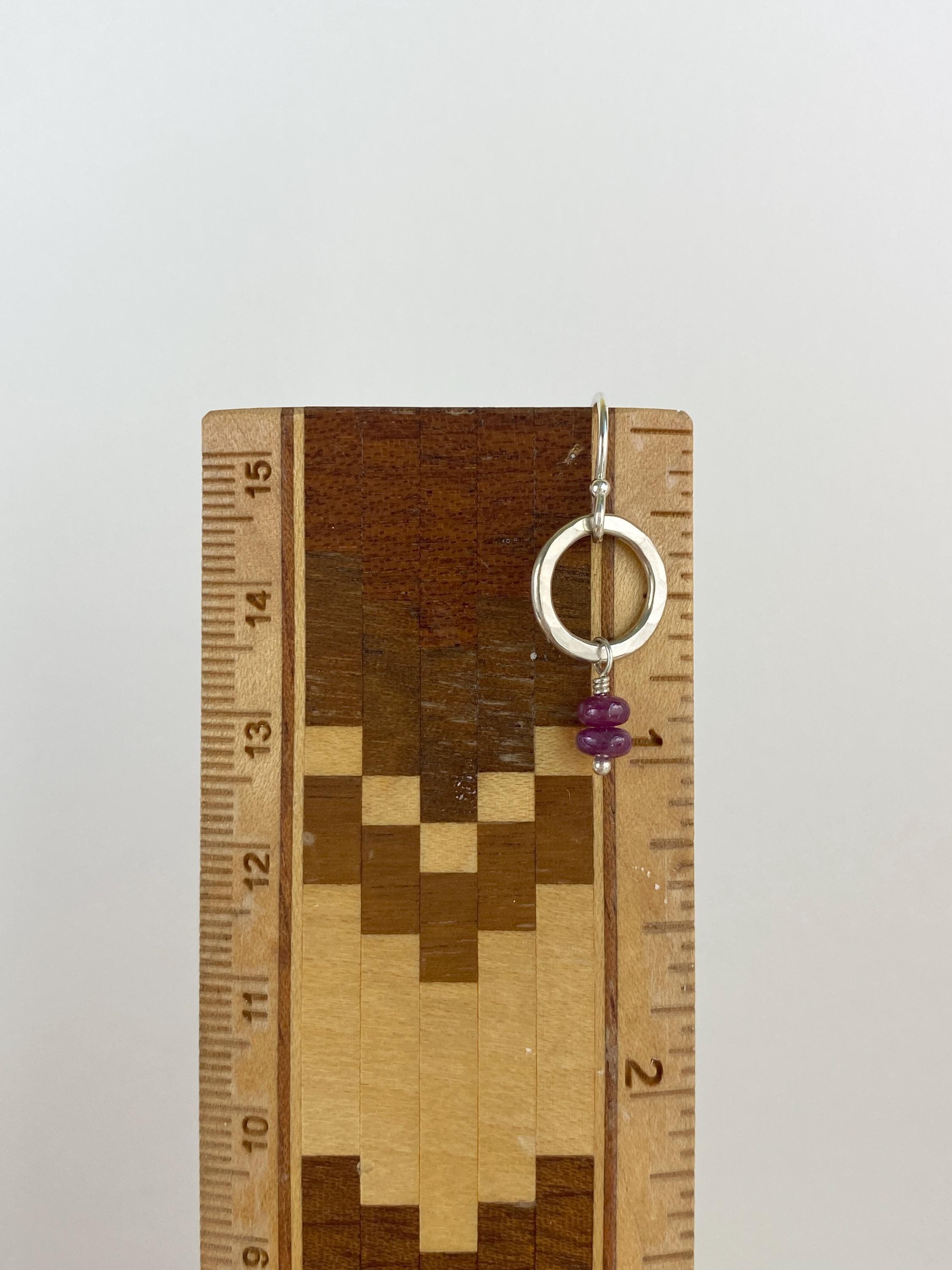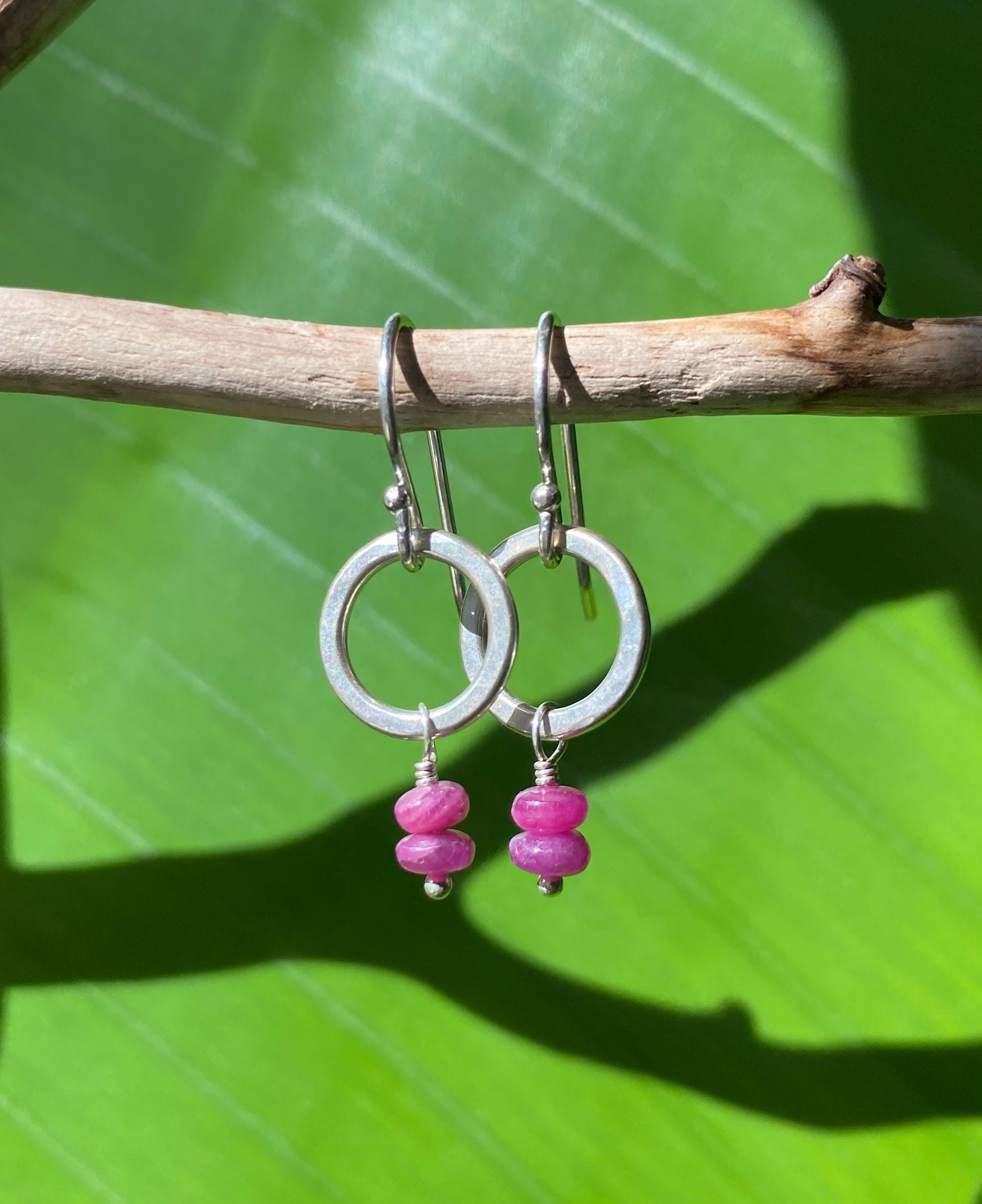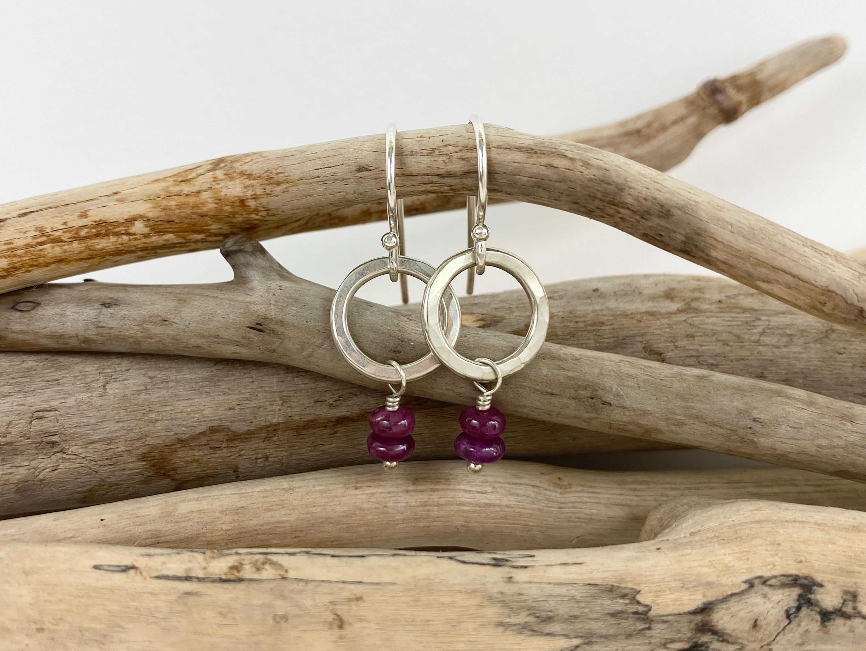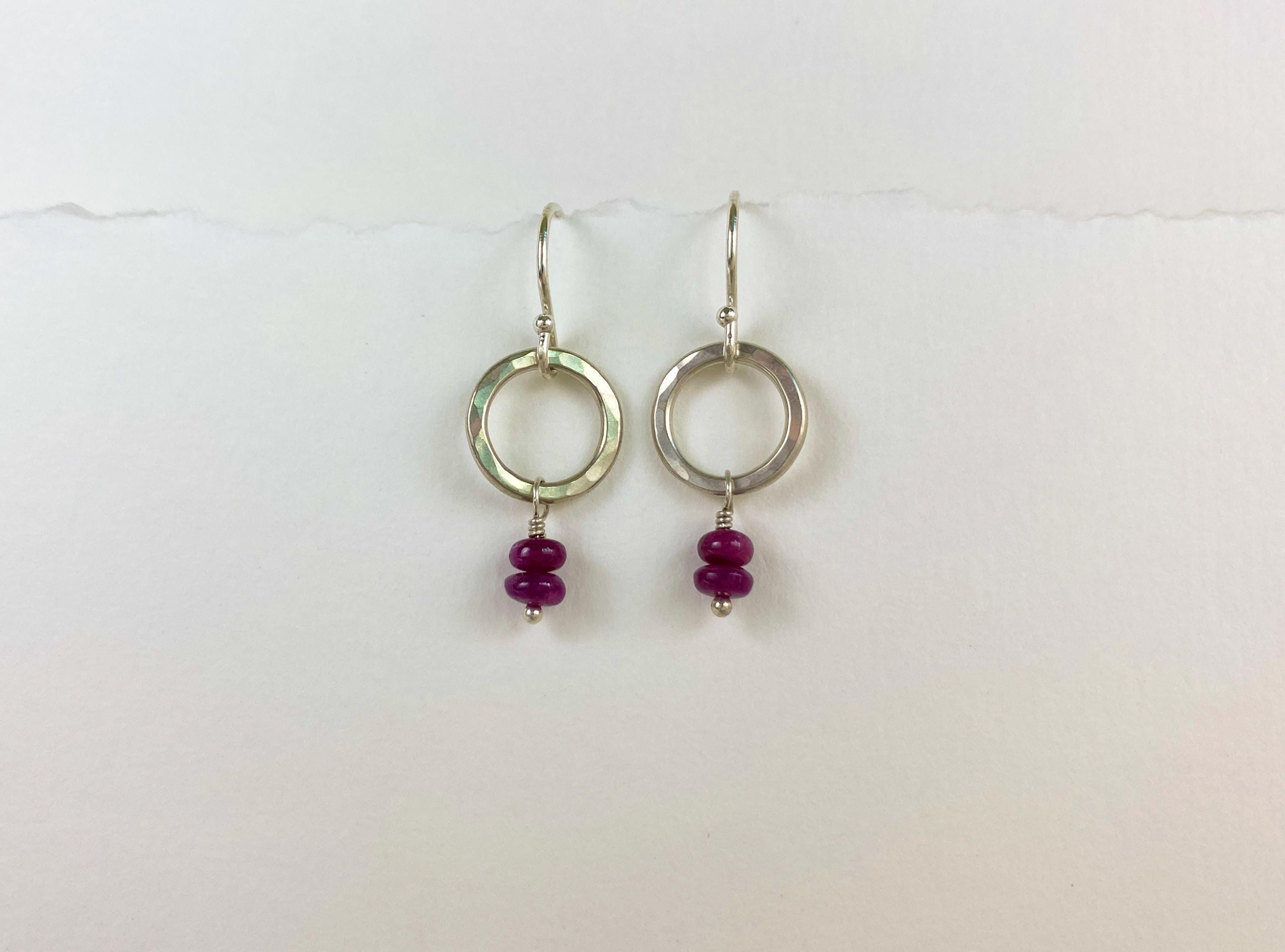 Pretty dangly earrings with real natural stacked ruby gemstones. The rubies are smooth round beads in deep pink/ red. These earrings are handmade from hammered sterling silver. Easy to wear everyday earrings. Each pair is handmade individually & so will be unique and may vary slightly. Stones are natural and may have inclusions/marks and vary from pair to pair. Rubies are the July birthstone.