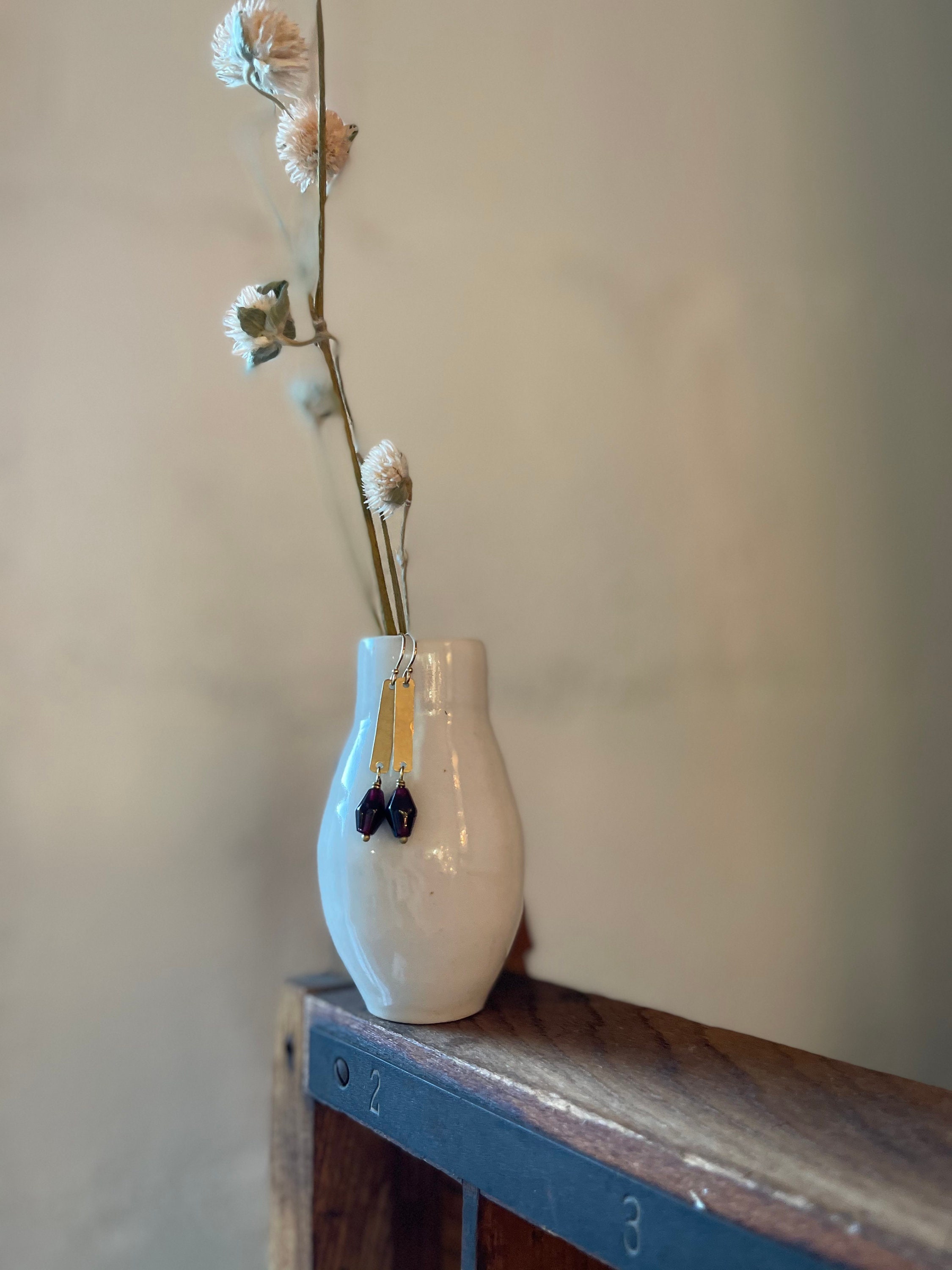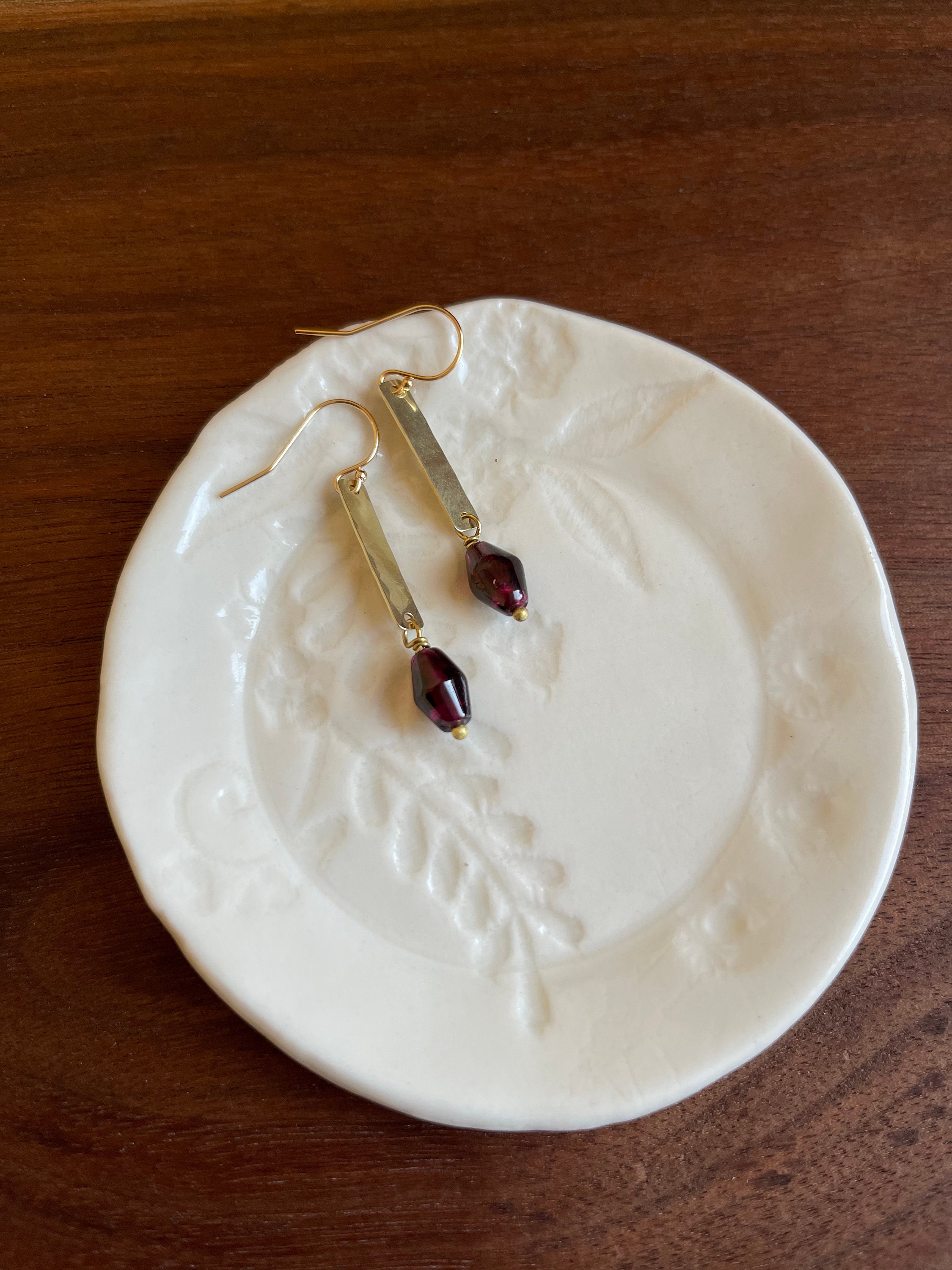 THIS IS A SALE/SECONDS PIECE. This means it is 100% useable and wearable but may have slight visual imperfections, or it may be a discontinued design, an experiment or just something I decided to put on sale : ) All seconds are final sales with no returns, repairs or exchanges.Long brass rectangle with natural garnet stones earrings.